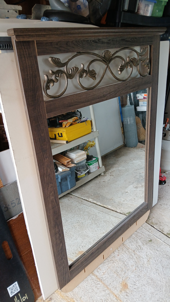 A large, wooden framed mirror featuring decorative scrollwork at the top. This is a good-looking oak style mirror has mounting flange to easily screw on to cabinet or wall free to a good home!