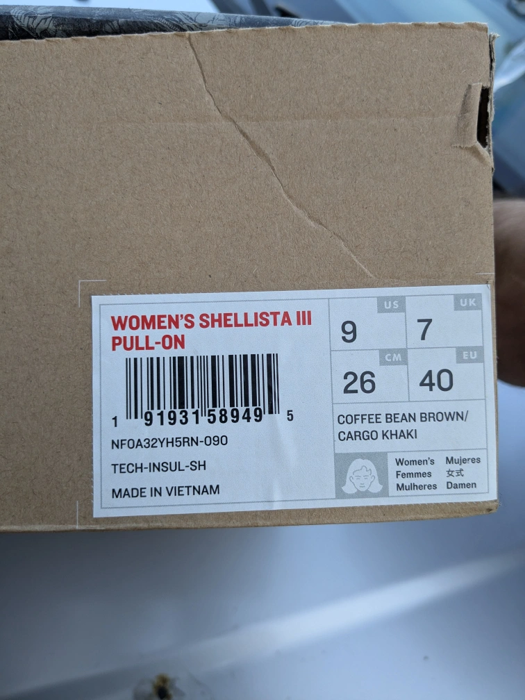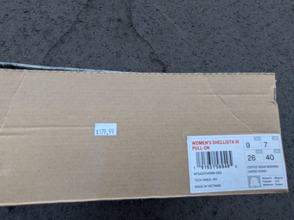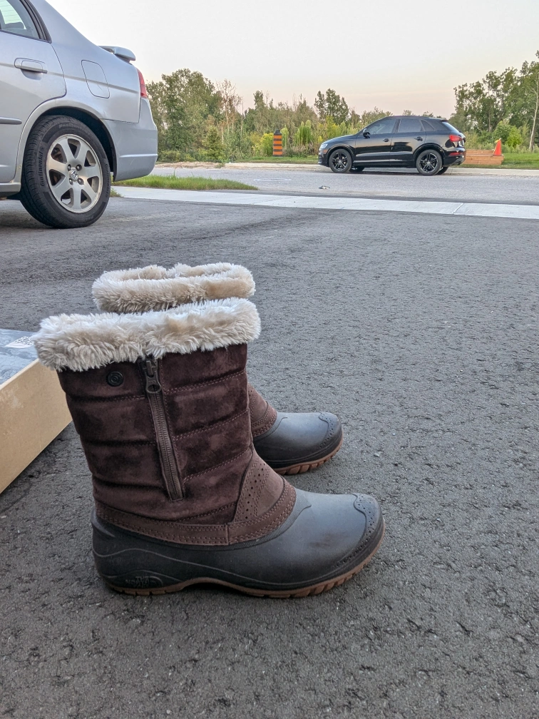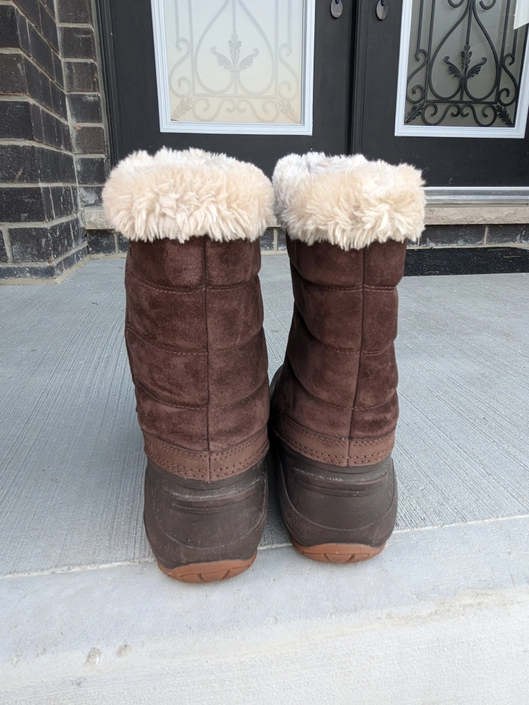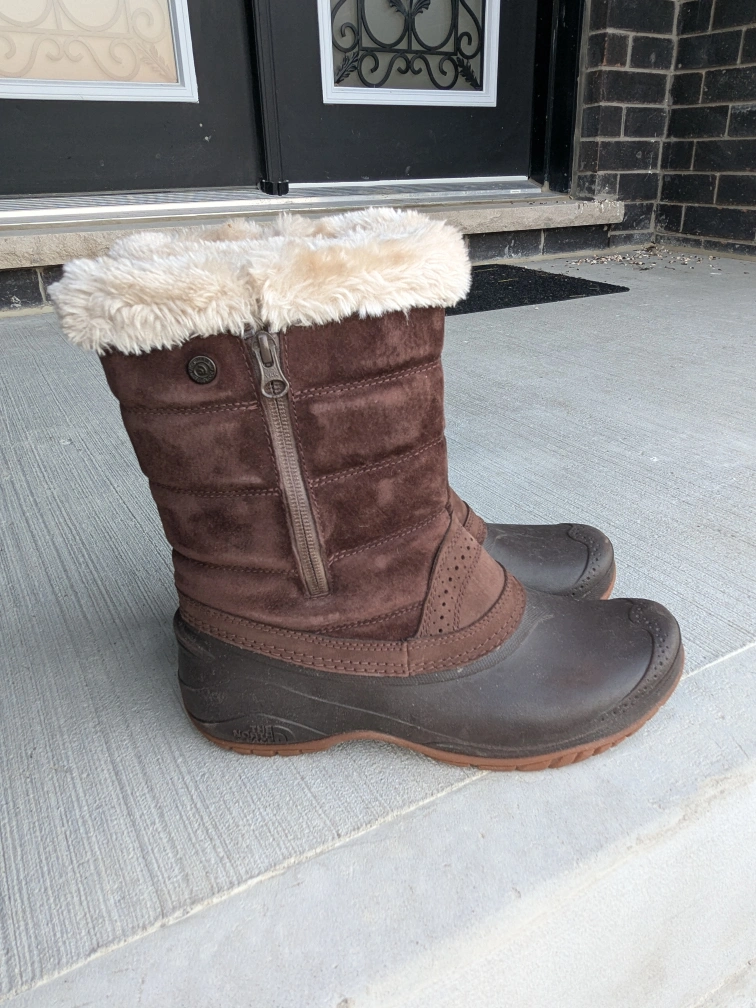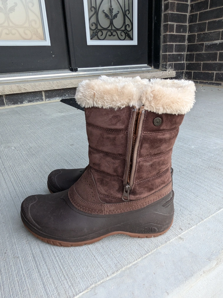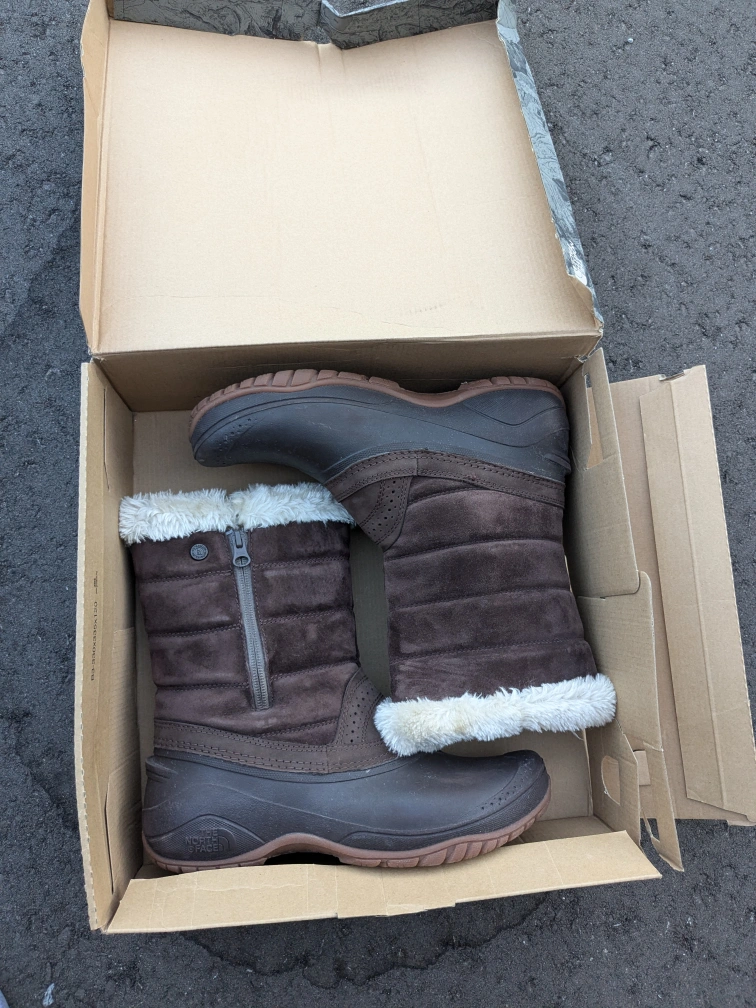 Women's brown suede winter boots by North Face. They have a zipper on the side, a faux fur lining, and a rubber sole. The boots come in the original box.