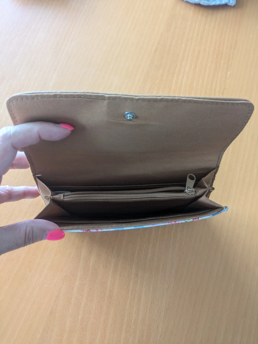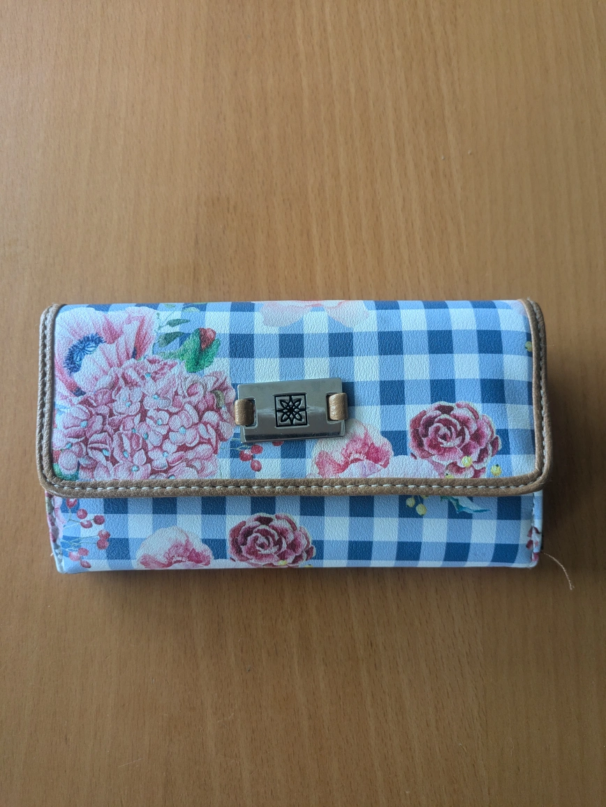This is a wallet with a floral and plaid pattern. It has a snap closure, a zippered coin pouch, and multiple card slots. It is in good condition.
