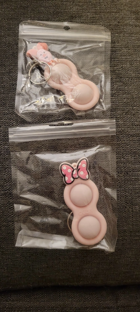 Two brand new keychain push pop fidget toys. One with piglet on it and the other with a minnie mouse bow. Both keychains have two bubbles to press.