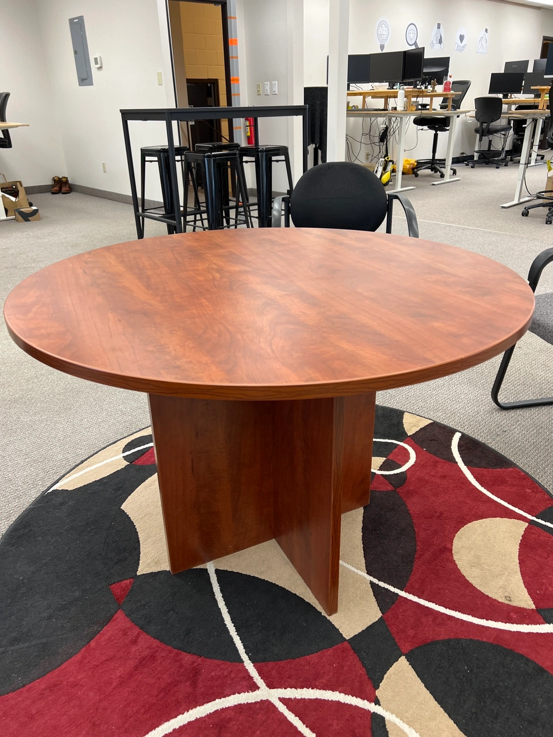 Large round wooden table with single pedestal base. Perfect for a conference room, dining room or family gathering. The table is in good condition and is a great addition to any home or office.
