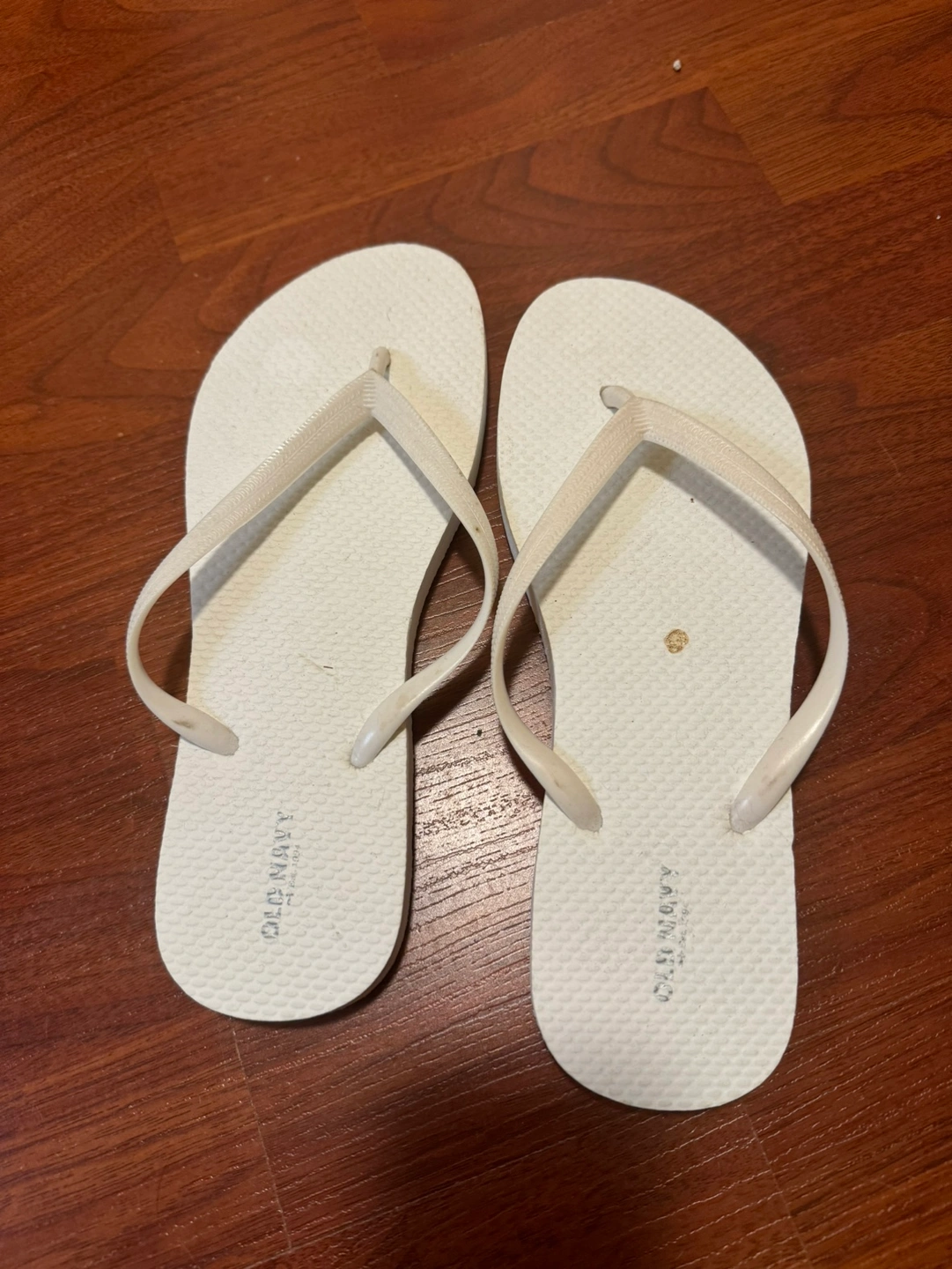 Pair of white Old Navy flip flops. (Right side has a brown mark on the top but still in wearable condition)