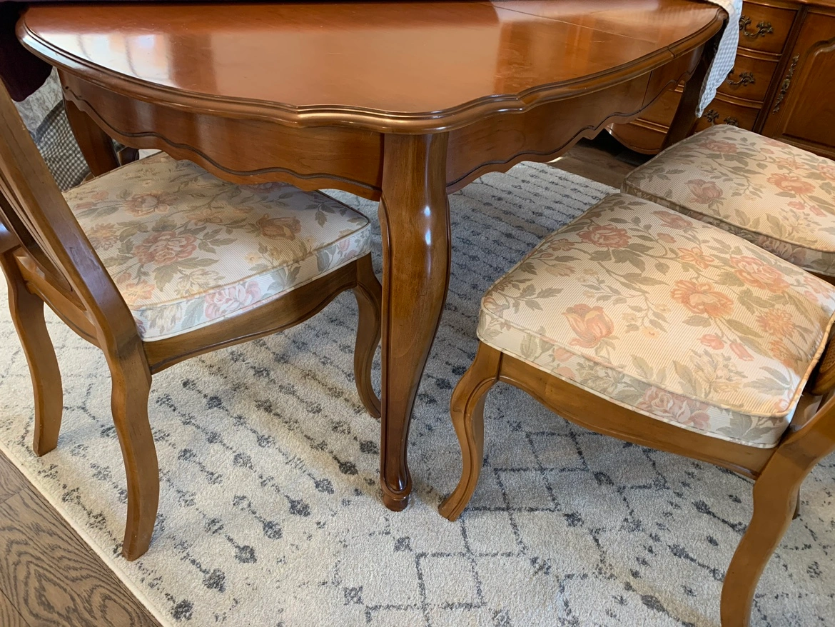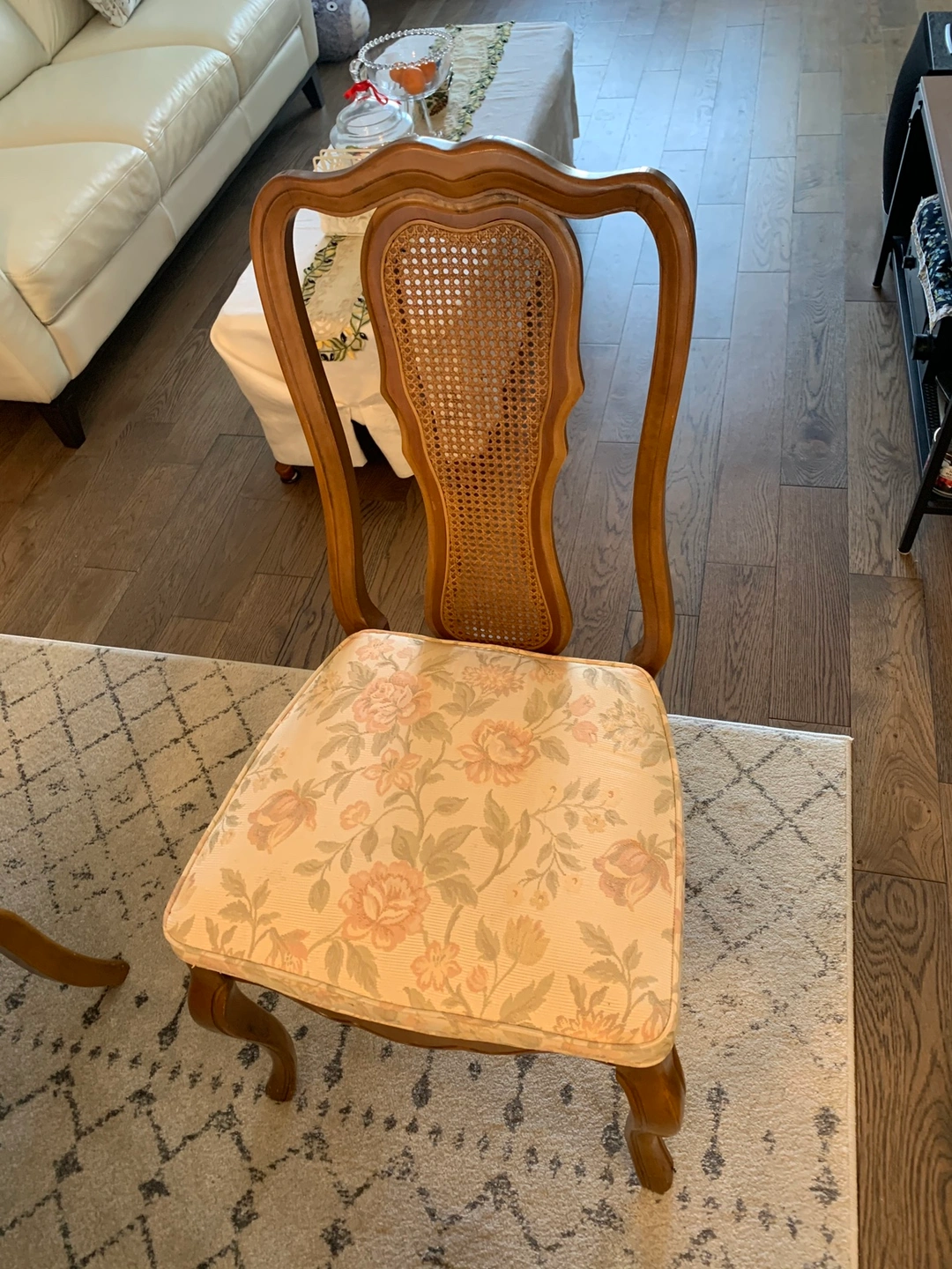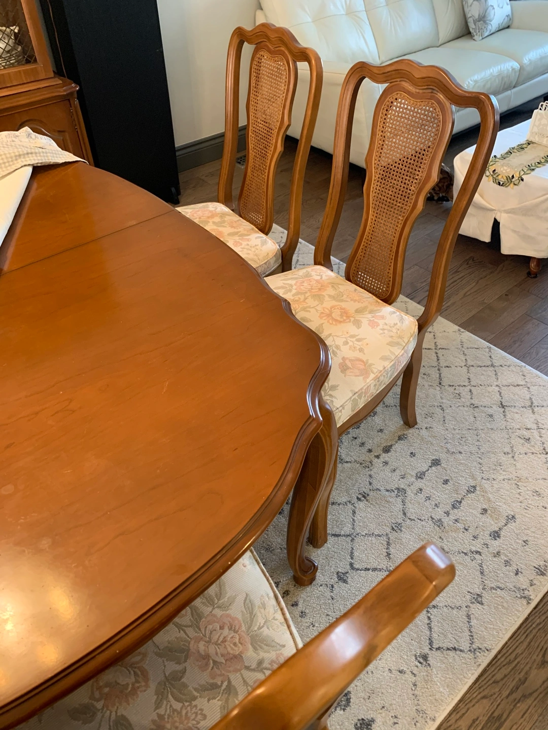 - Includes 4 matching chairs with comfortable, padded seats in a floral pattern.