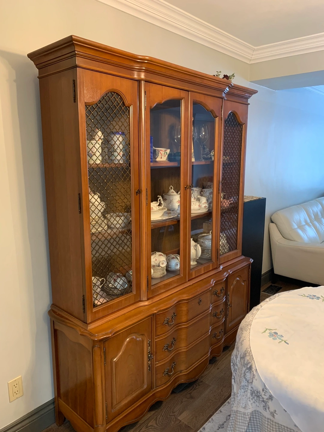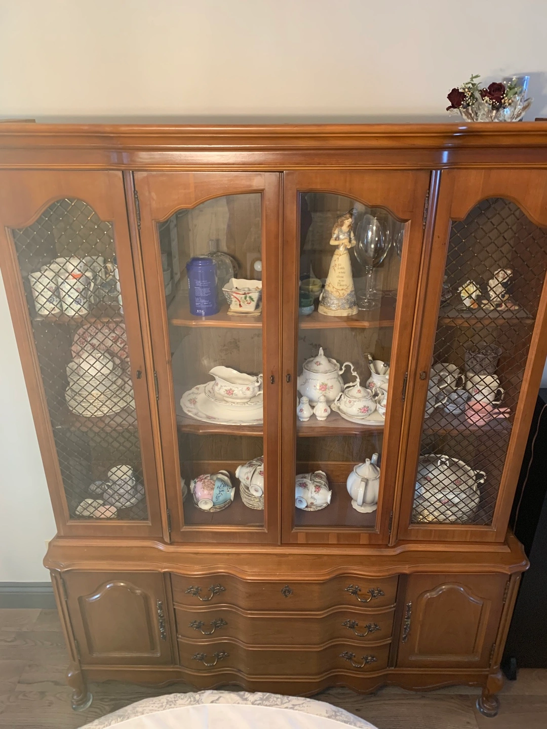 - Features glass doors with intricate wire mesh details, perfect for displaying fine china or collectibles.