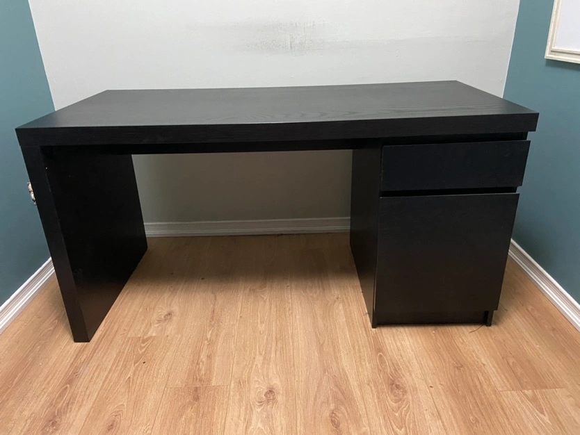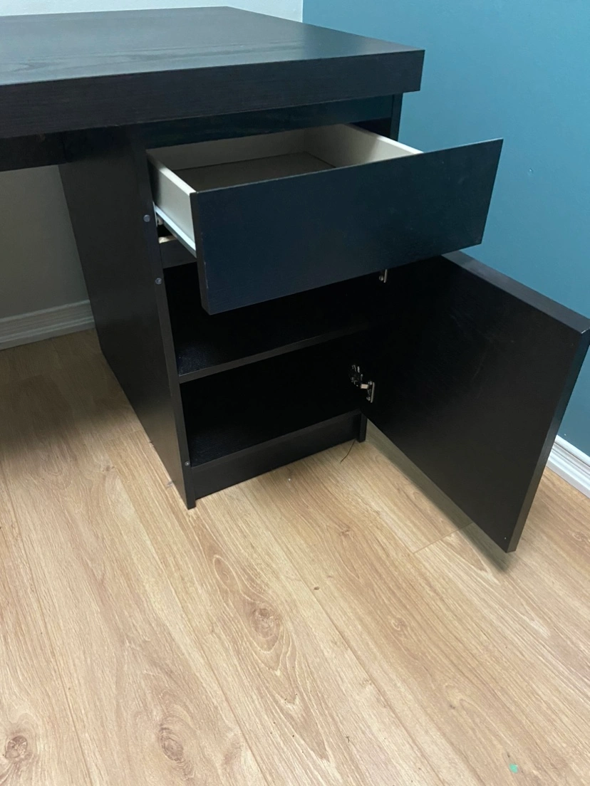 Black IKEA desk with one drawer and a cabinet with a shelf.