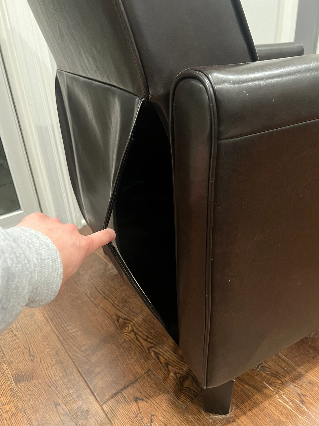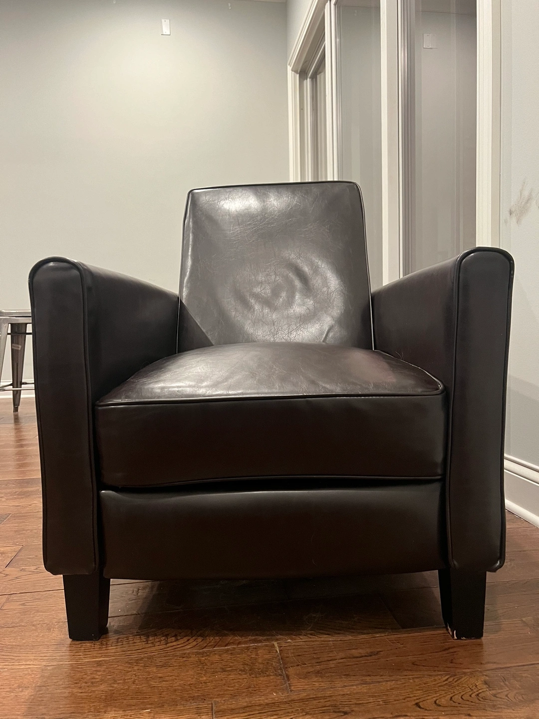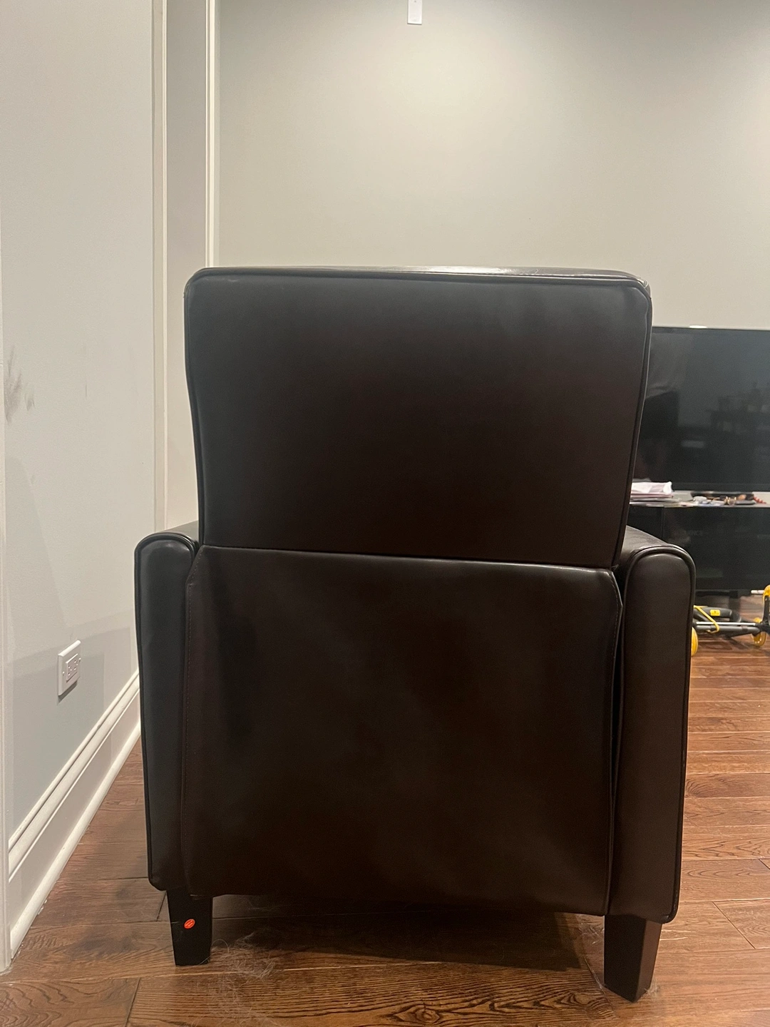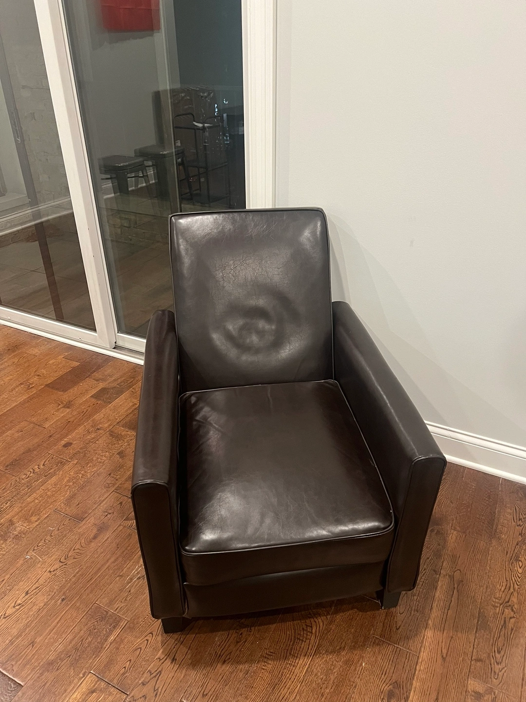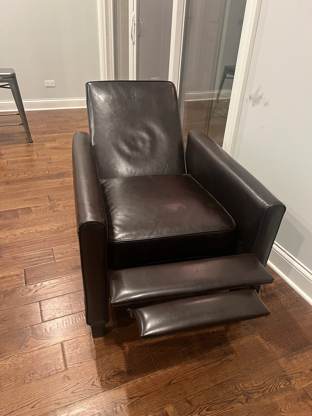 Dark brown reclining leather chair. The leather is supple and soft. The chair is comfortable and perfect for relaxing.