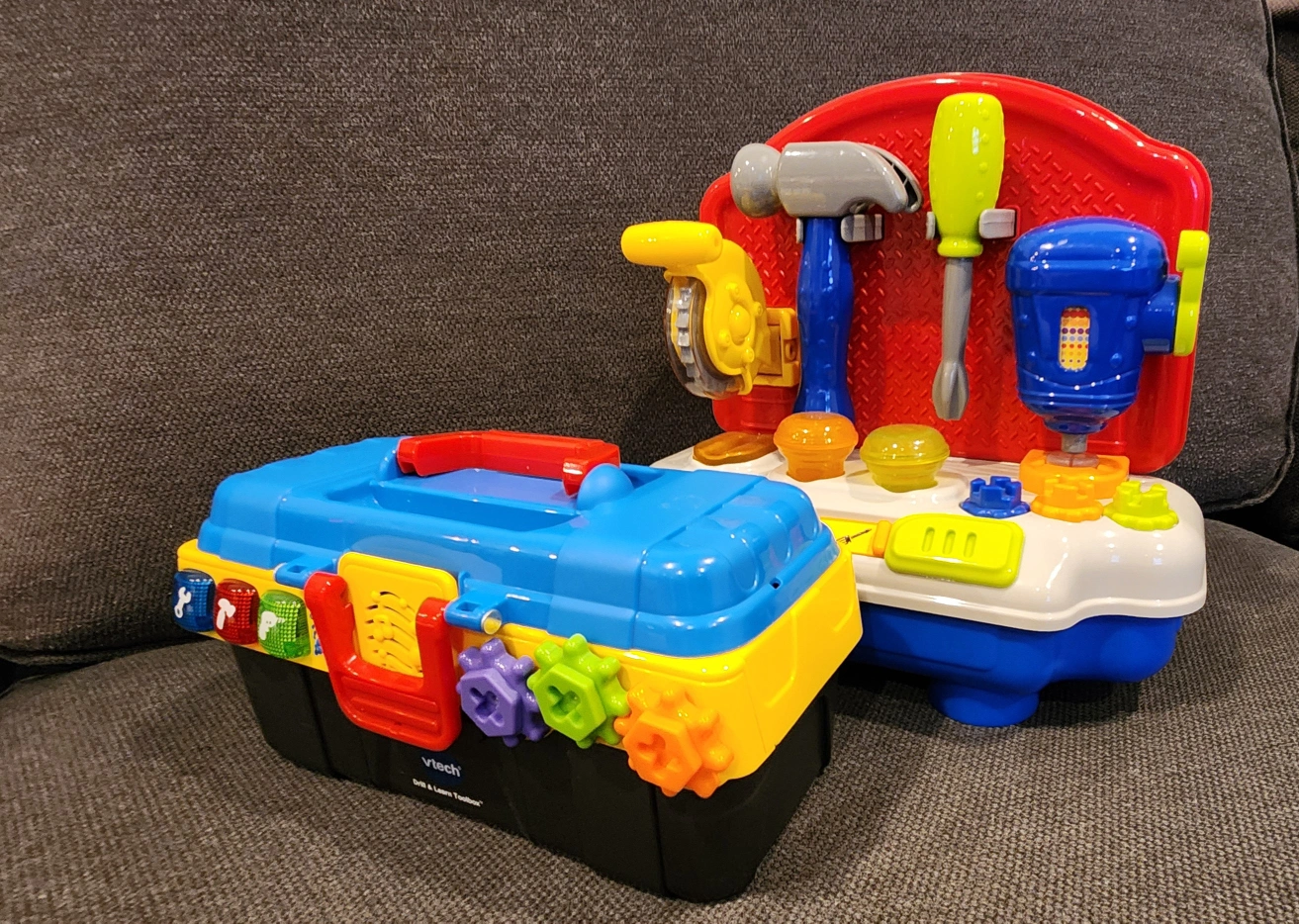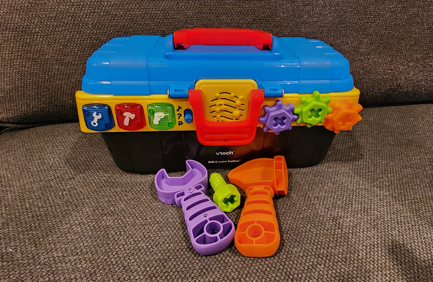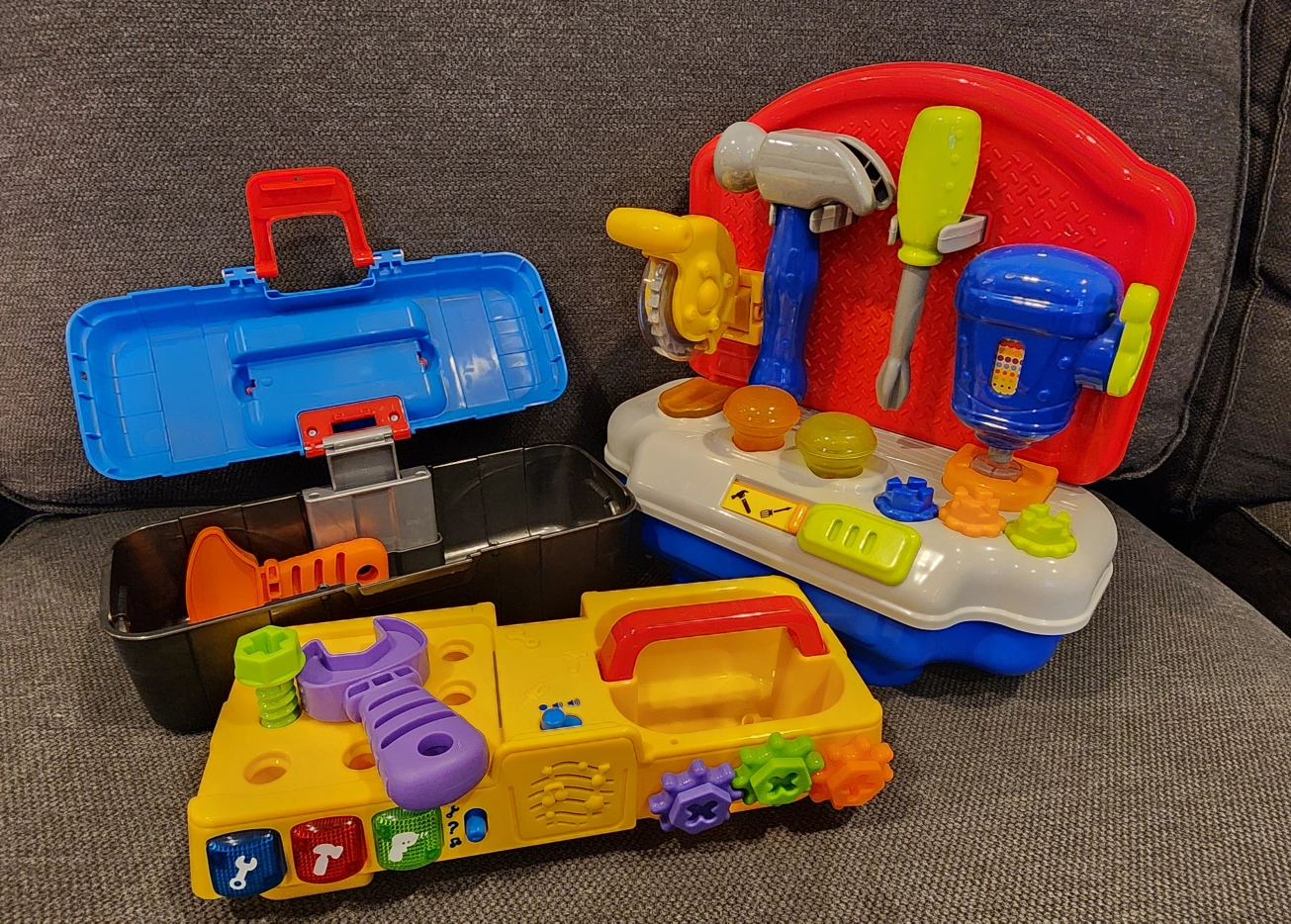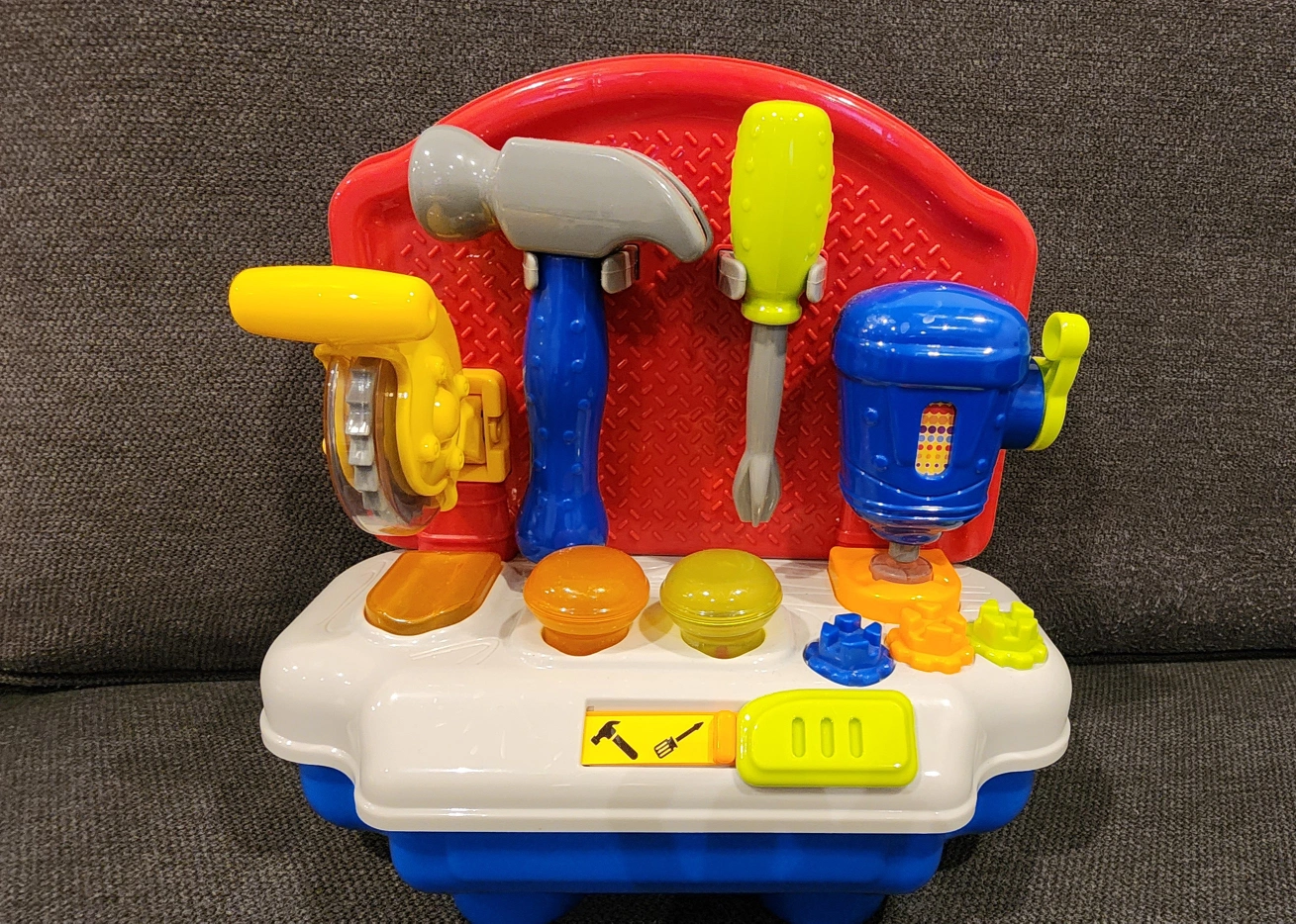 Includes an electronic fix-it tray, drill, hammer, wrench, nails and screws
