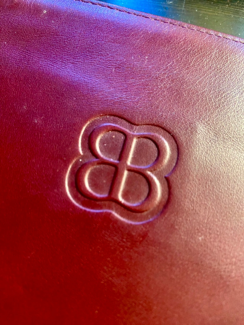 A burgundy leather wallet with the Balenciaga logo. It features gold accents. Absolutely authentic ! Guaranteed . Never used . Bought and stored .