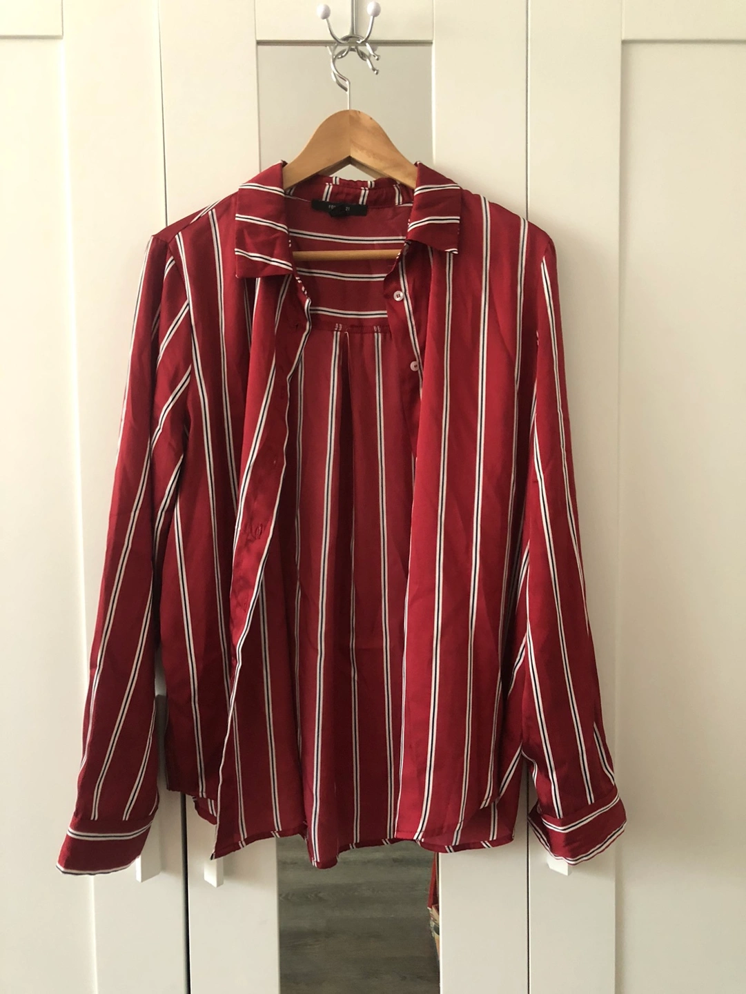Red and white striped long-sleeved blouse. Shiny silky material. I liked to wear it as an overshirt over a tank top or tight t-shirt!