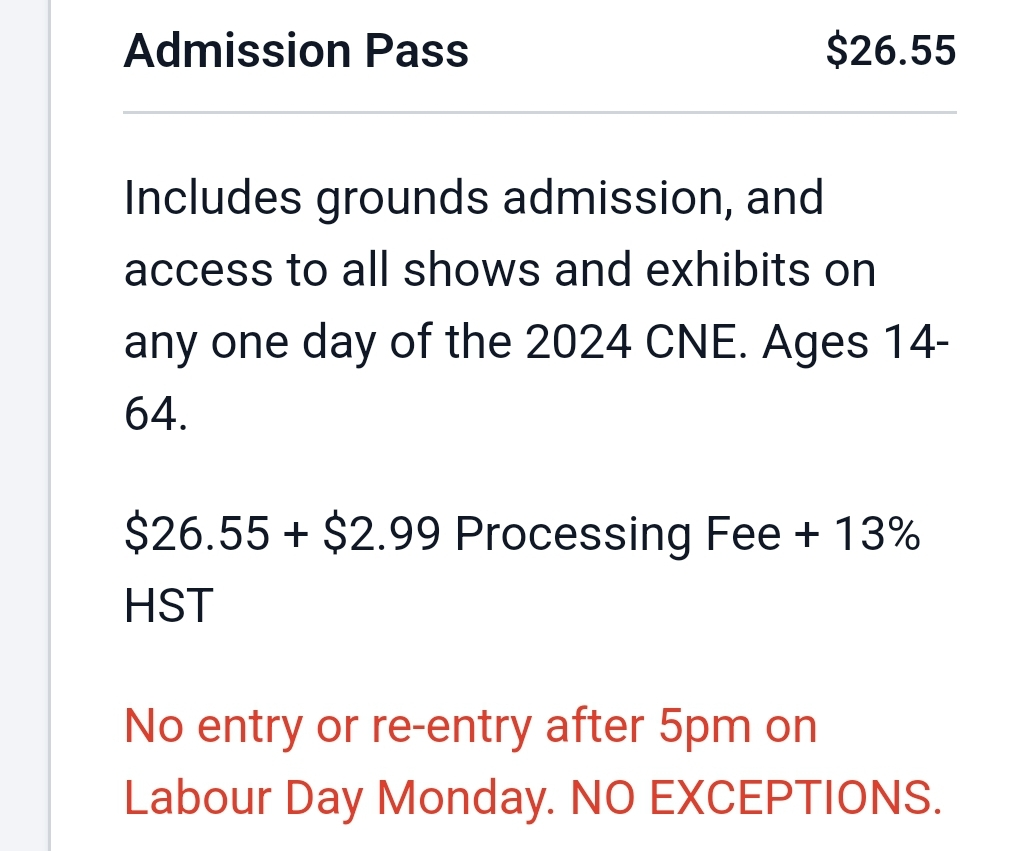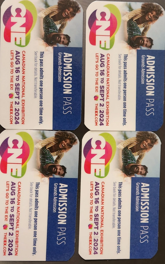 2 adult admission passes for the Canadian National Exhibition valid for one person, one time only. Valid August 16 to September 2, 2024.