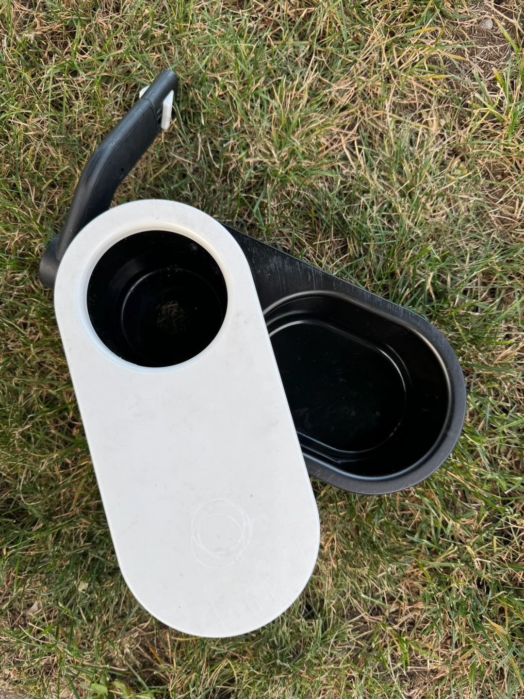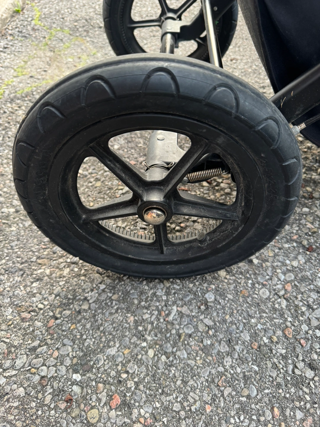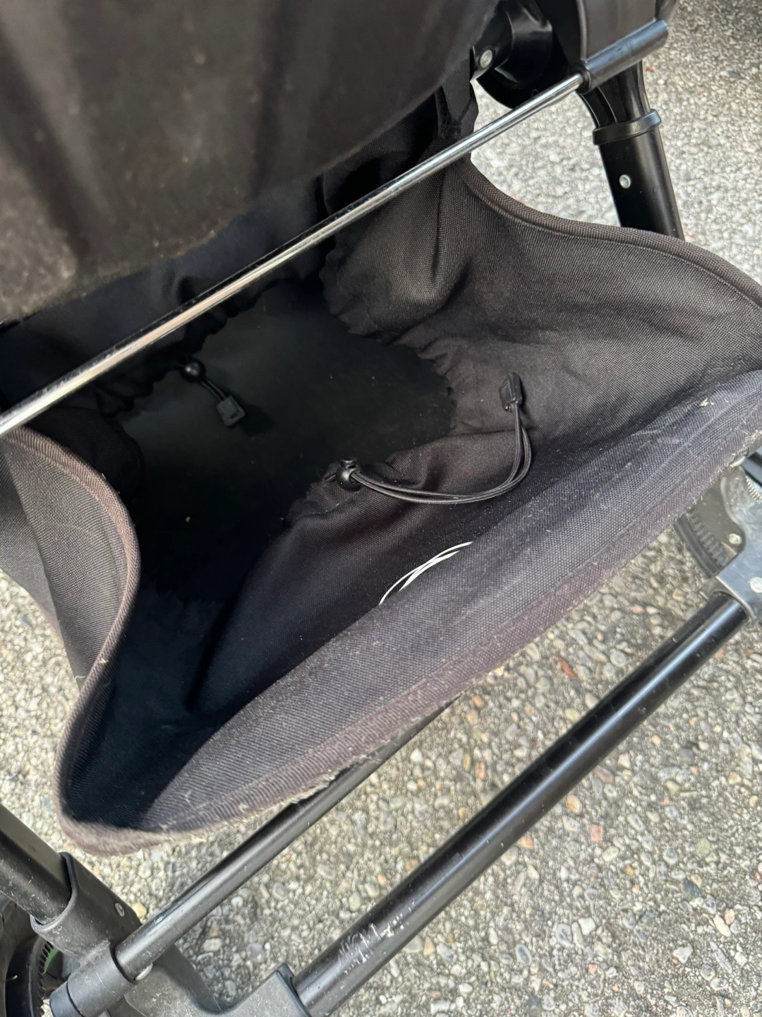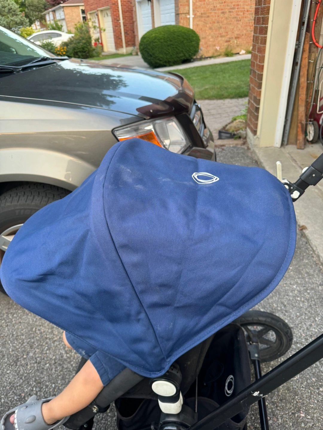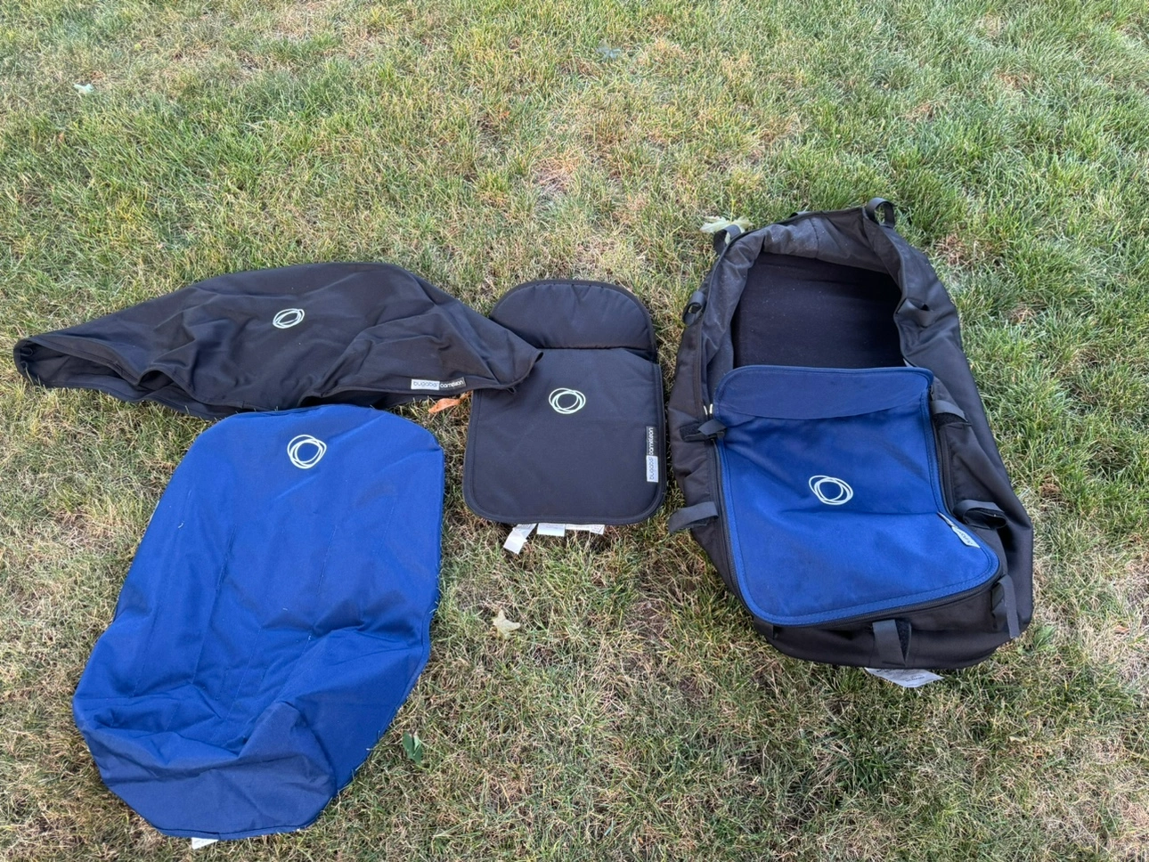 Excellent used condition Bugaboo stroller. There is a rip in the handle as seen in the picture and missing the belly bar. Comes with a rain cover for stroller and a car seat, two different fabric colours blue and black. As well as snack holder.