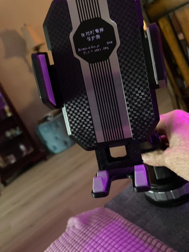 This is a car phone mount that attaches to your windshield/dash. It can be adjusted to fit a variety of phone sizes. It is made of black plastic with a silver finish. It has a sticky pad on the bottom for attaching to the windshield./dash
