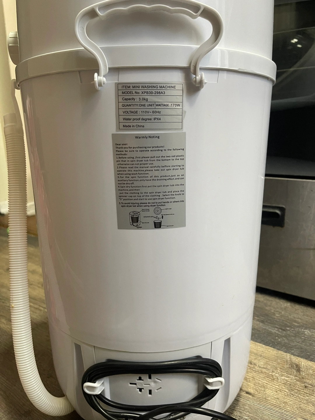 A mini portable washer. Barely used. Volume can fit about 5-6 tshirts plus 2 pairs of pants and some small items at once. Good for delicates. Comes with a small drying tube that can fit a small volume of clothes to tumble dry.