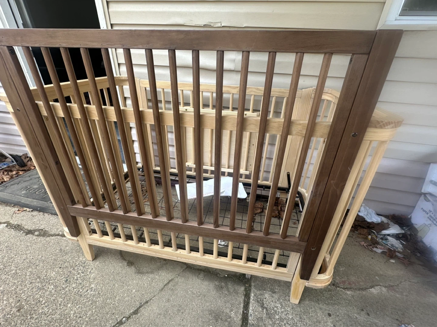This is a wooden baby crib. It features a two-tone design with lighter wood on the inside and darker wood on the exterior frame and top rail. The slatted design ensures good airflow.