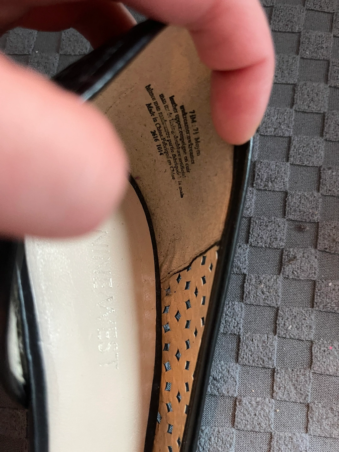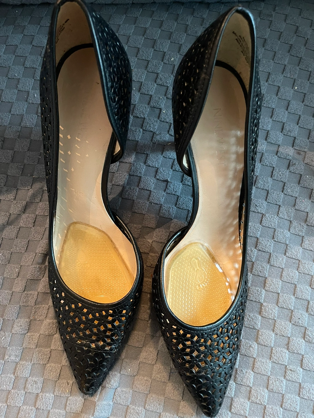 Black Nine West heels with floral eyelet design. Size 7.5M. They are in good condition, a little bit of bending around the heels.