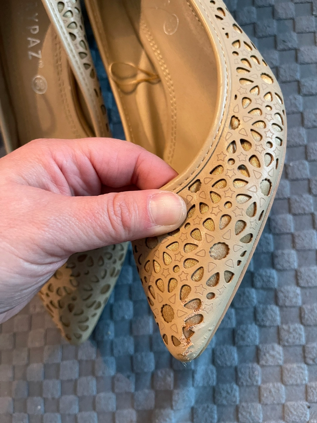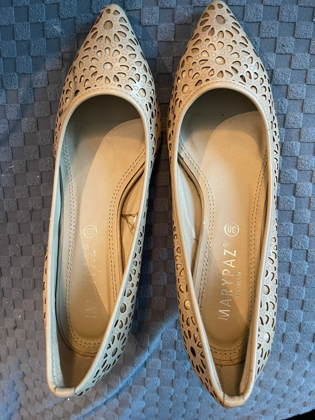 These are a pair of beige heels with a cut-out design. The size is 38. Has some wear on the toes, which is pictures.