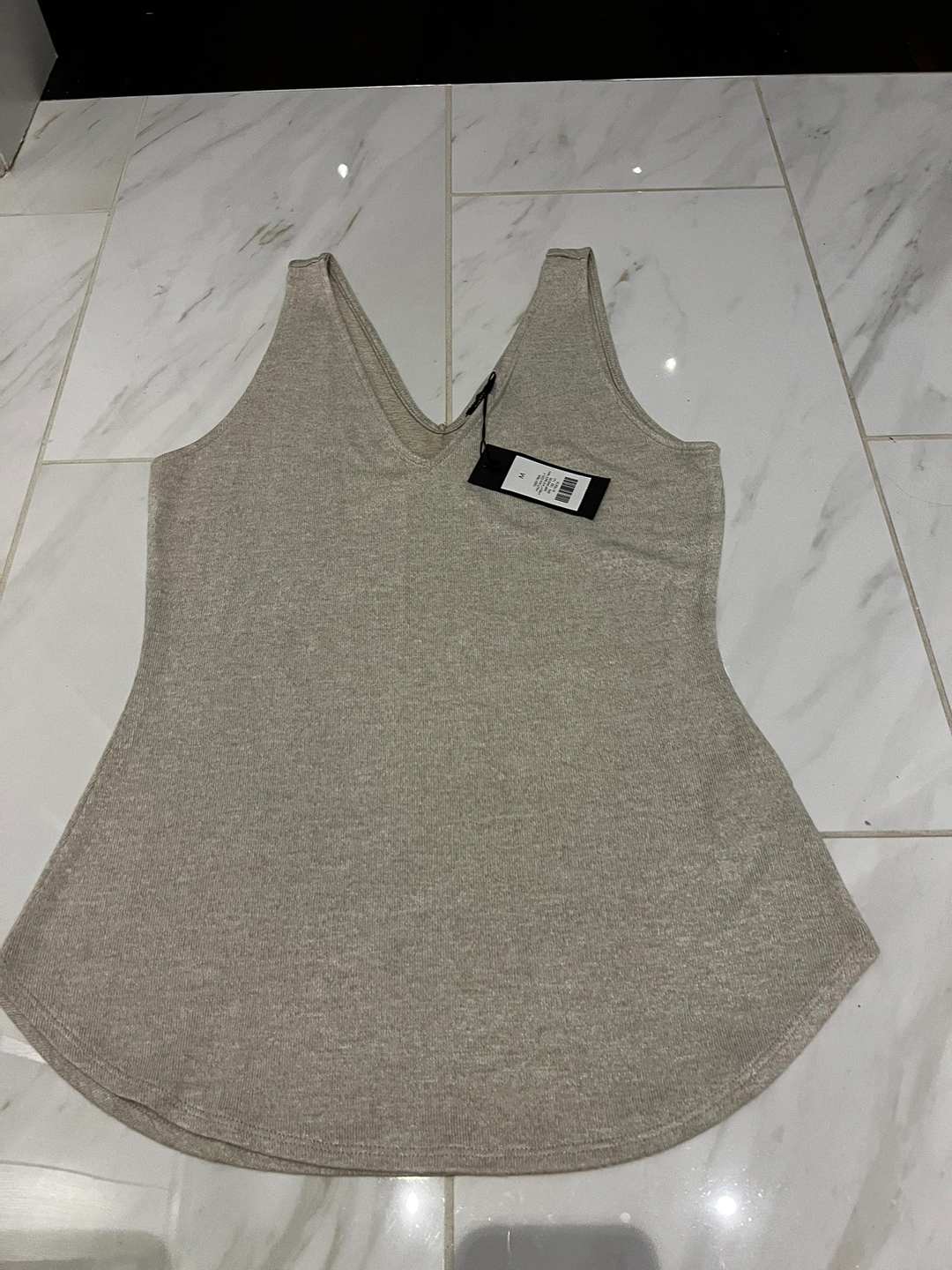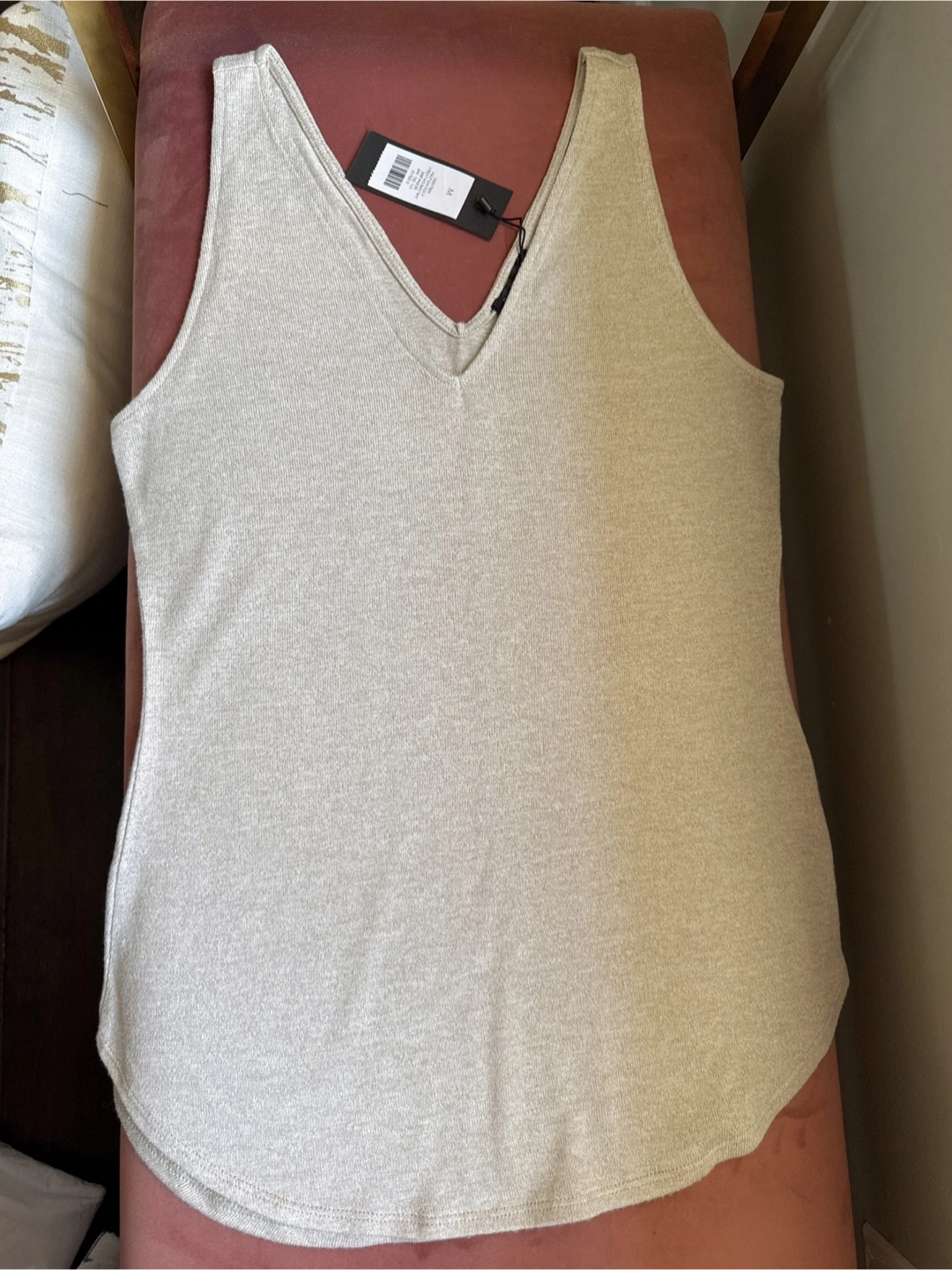 A sandy beige tank top with a V-neck and a fitted silhouette. Very soft fabric, lightweight but not see thru, with some weight .