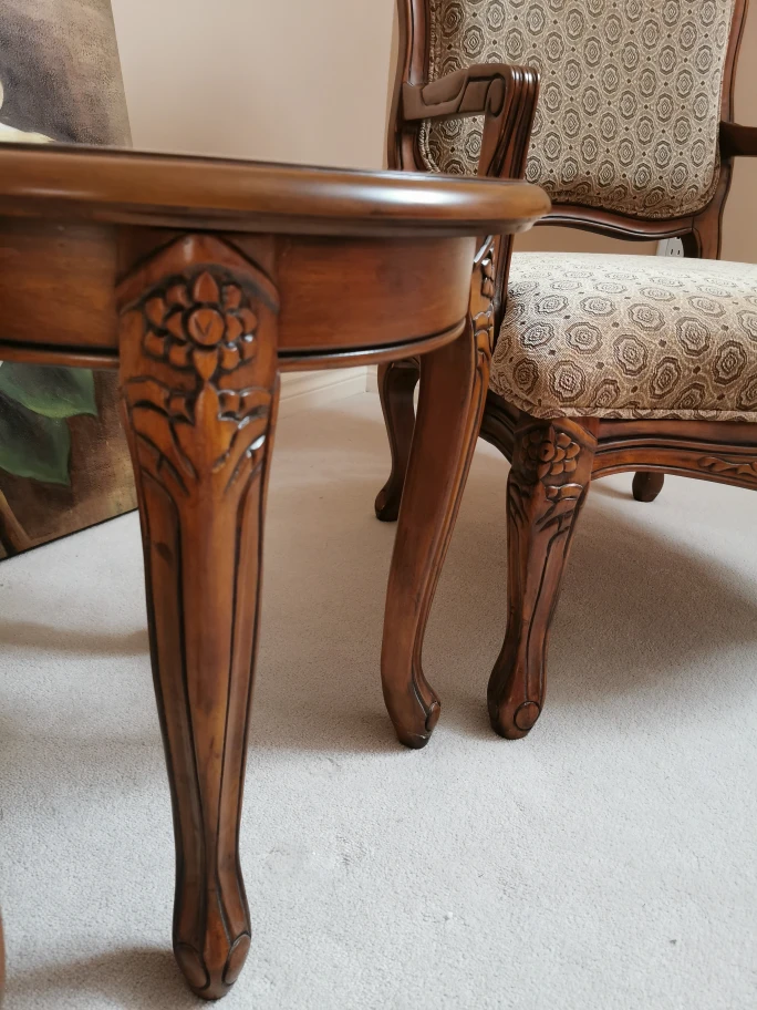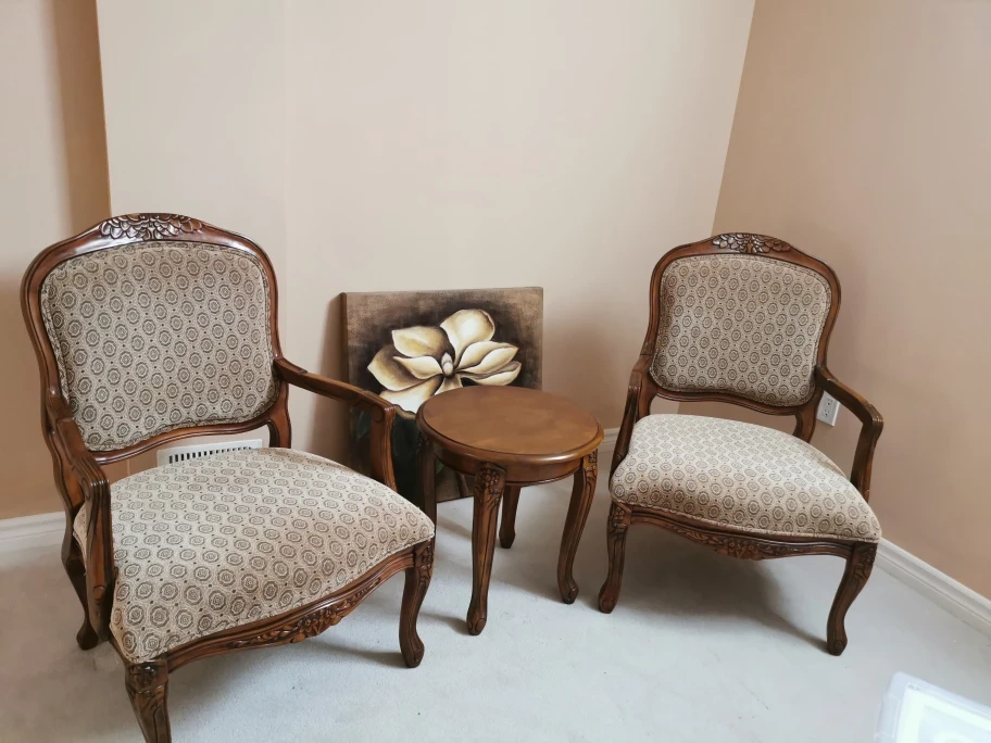 Beautiful matching armchairs with a coordinating round table.The armchairs have a floral fabric upholstery with wood frame and legs. In great condition, like new.