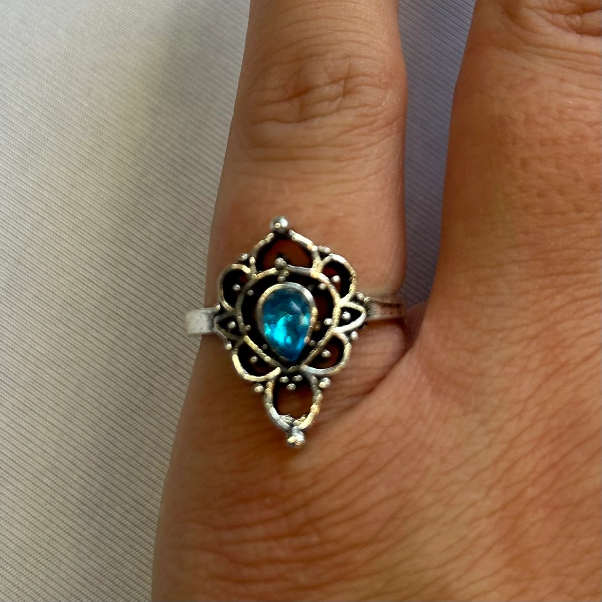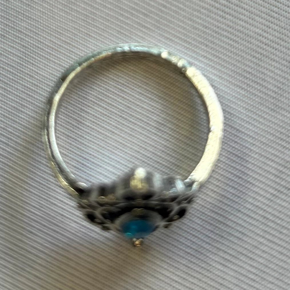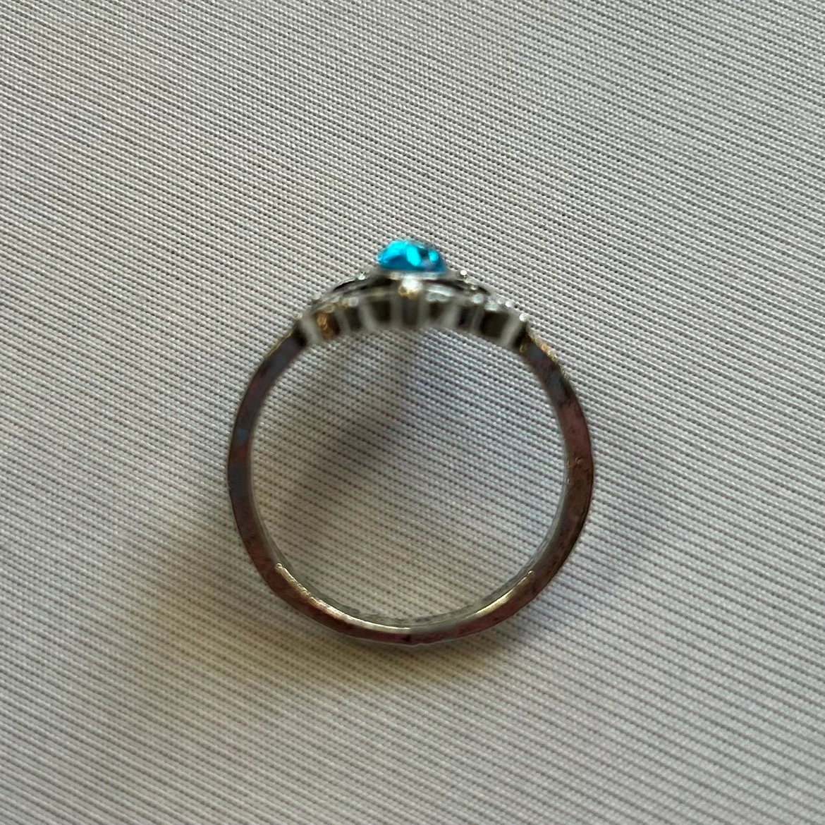New in package! This exquisite boho-inspired ring features a captivating turquoise stone at its center, exuding a vibrant, sky-blue allure. The stone is elegantly framed by a silver-toned mandala design with delicate bead detailing, enhancing its bohemian charm. Its intricate openwork adds a touch of sophistication, making it a standout accessory for any occasion. New, never worn. Size 7.5. Cross posted.