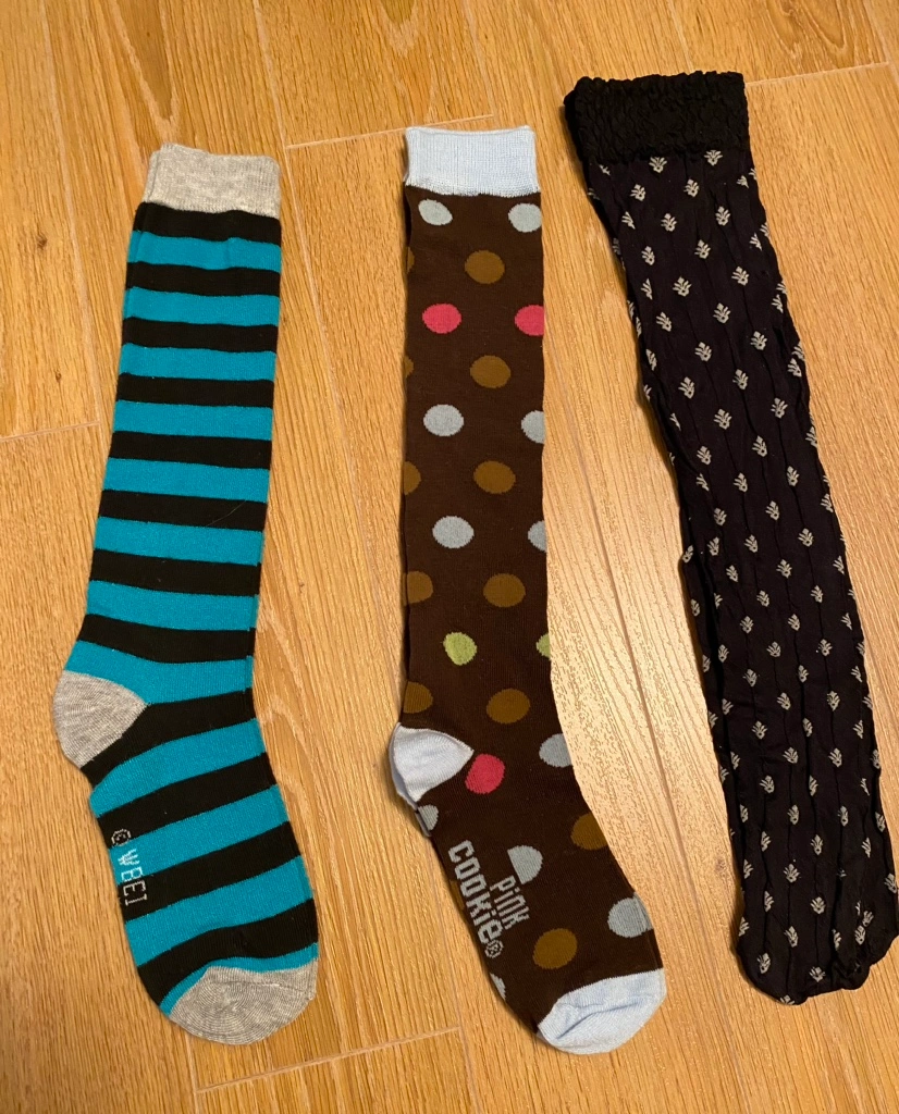 3 pairs of brand new women's knee-high socks, two pairs are cotton, one pair is nylon. They are all different designs and colors. $3.00 for each pair and may give discount if buy the whole lot (3pairs).
