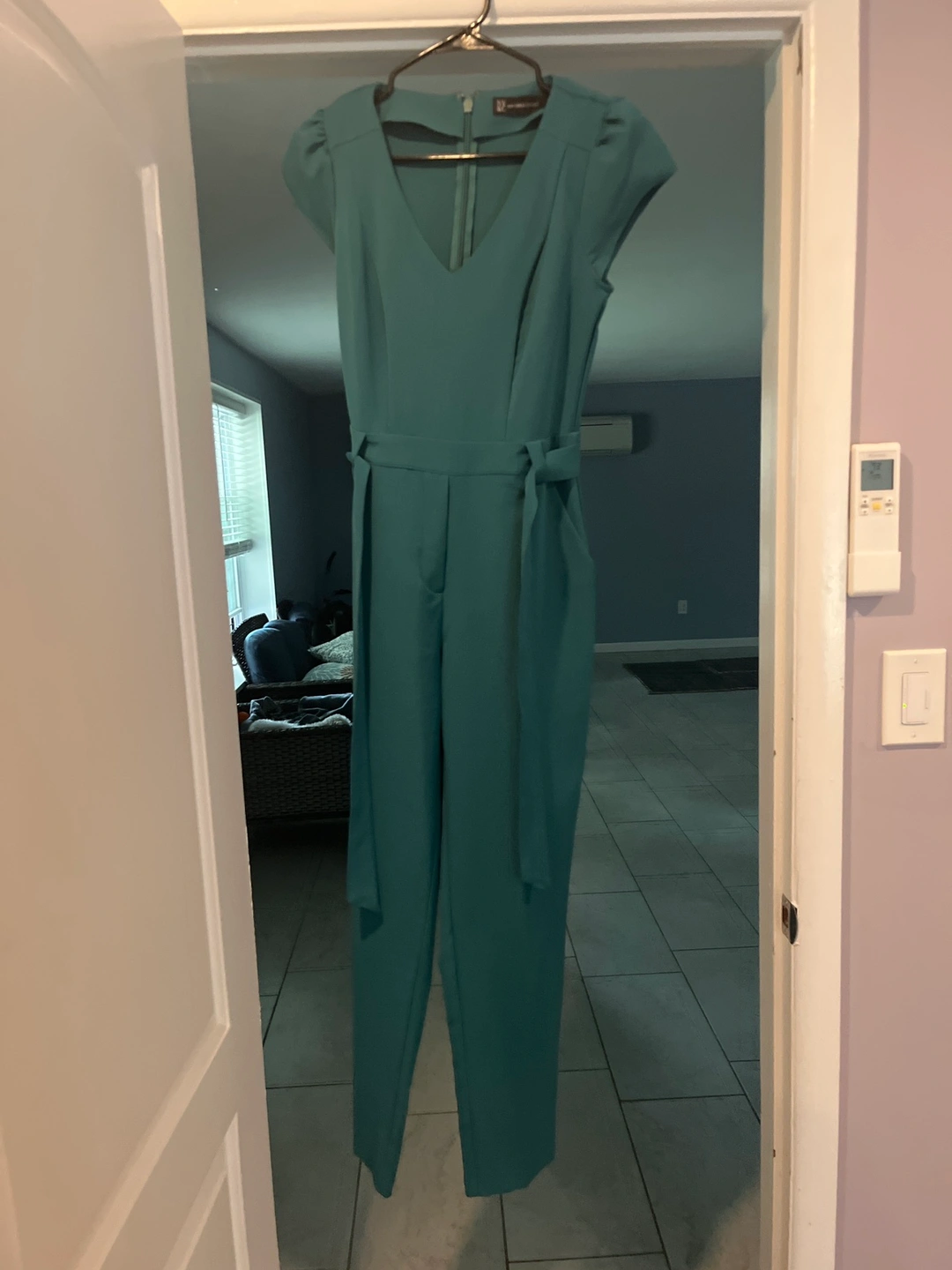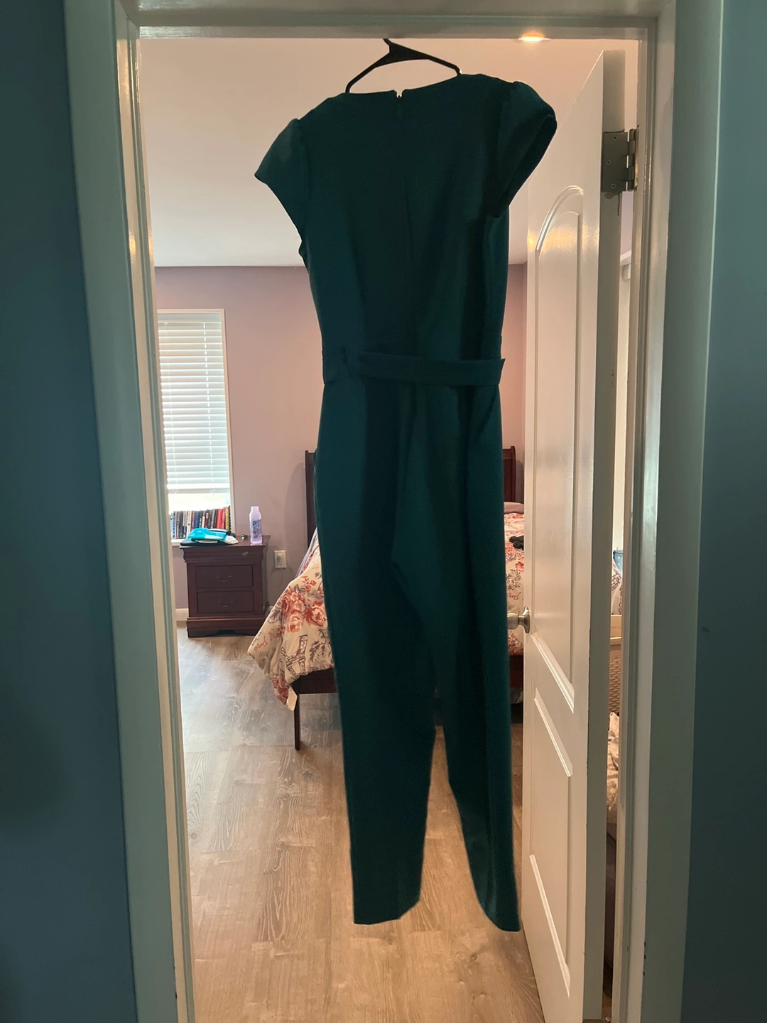 Green jumpsuit with short sleeves, a V-neck, and a belt. The jumpsuit has pockets on the sides. The fabric is a soft, stretchy material. Only worn once.