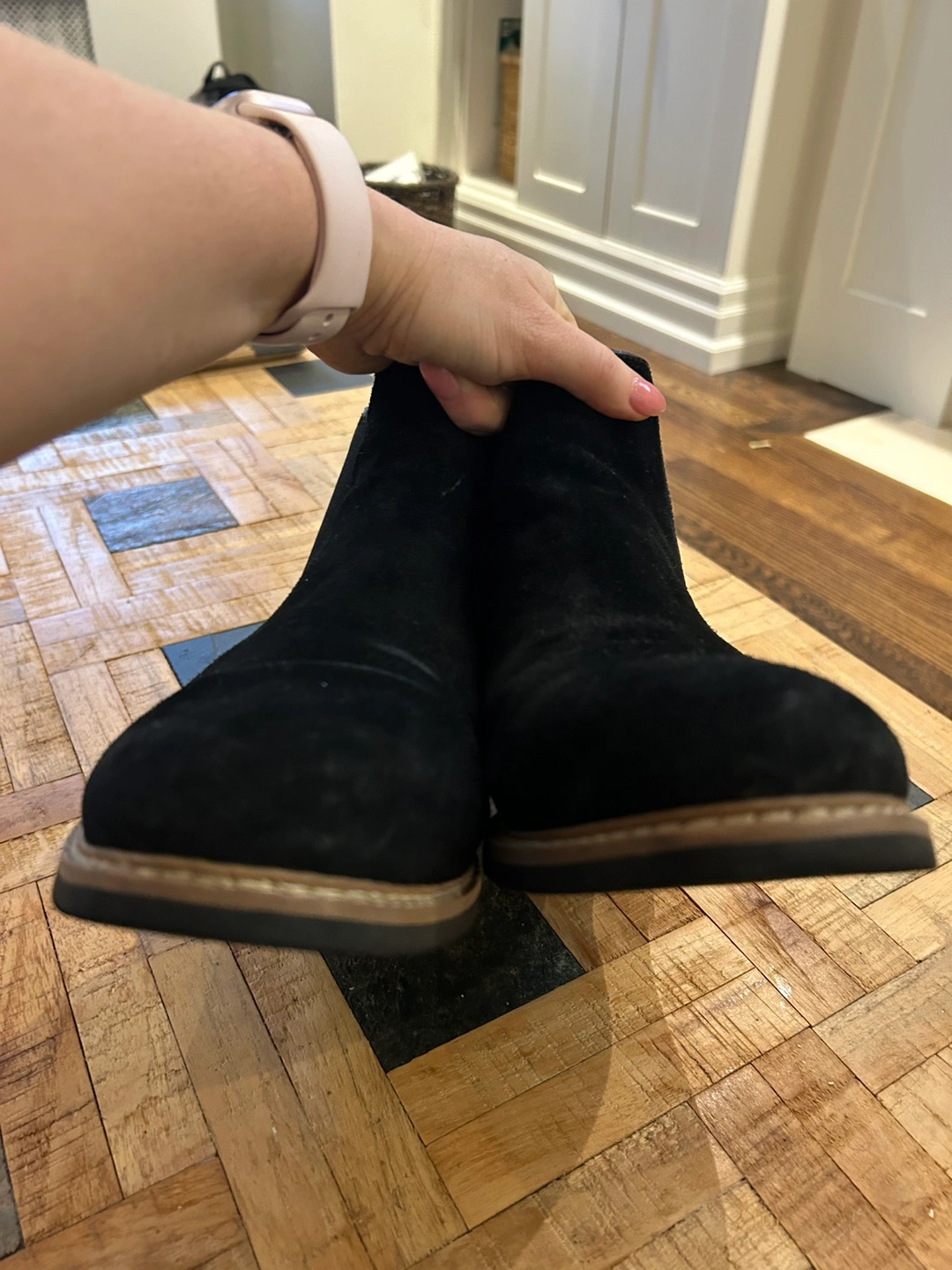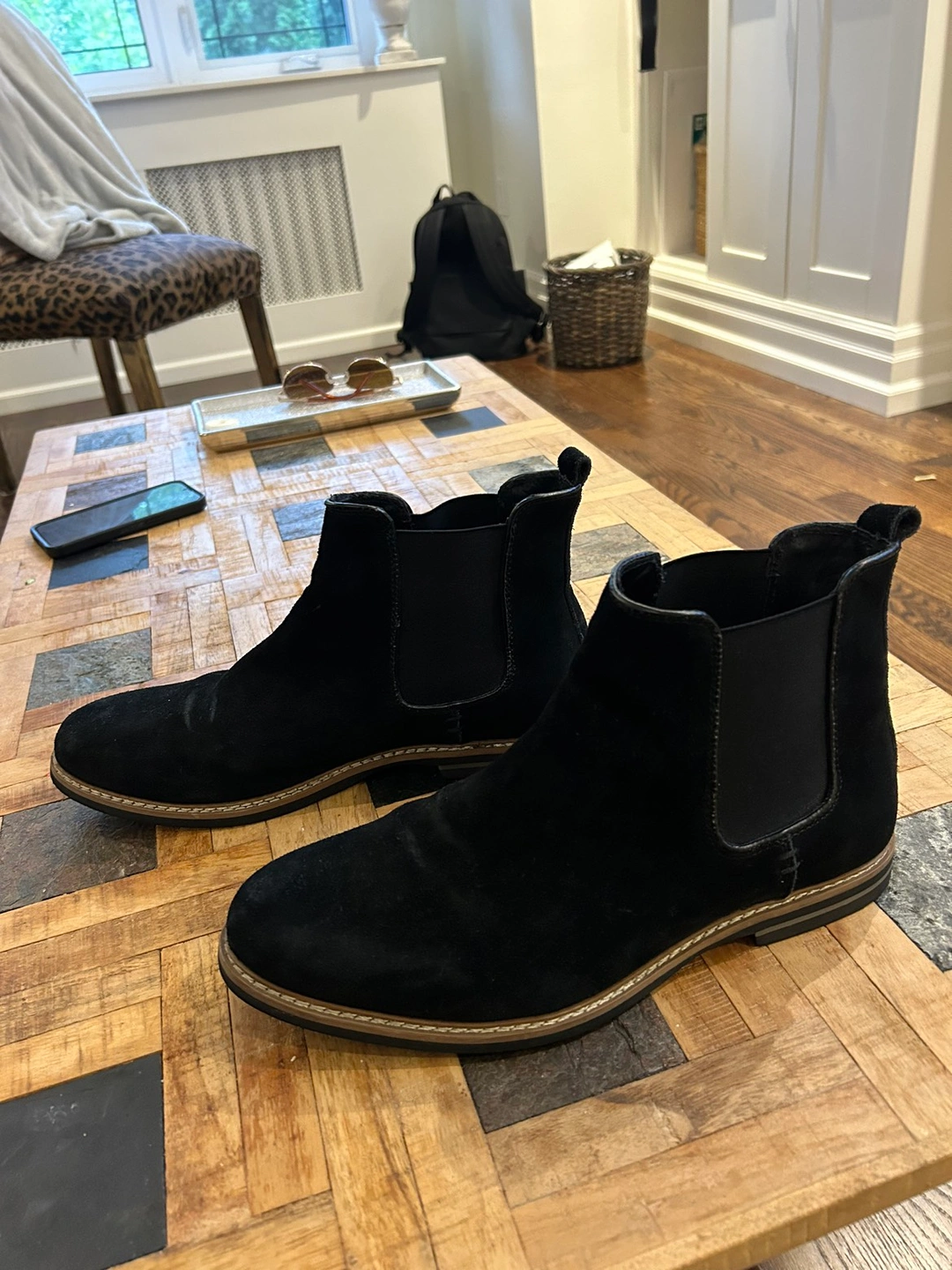 My husband is between and 10 and an 11 and this is a 10 so too tight! These have been worn once. Excellent condition. Real suede: nice thick sole so good for winter and fall.