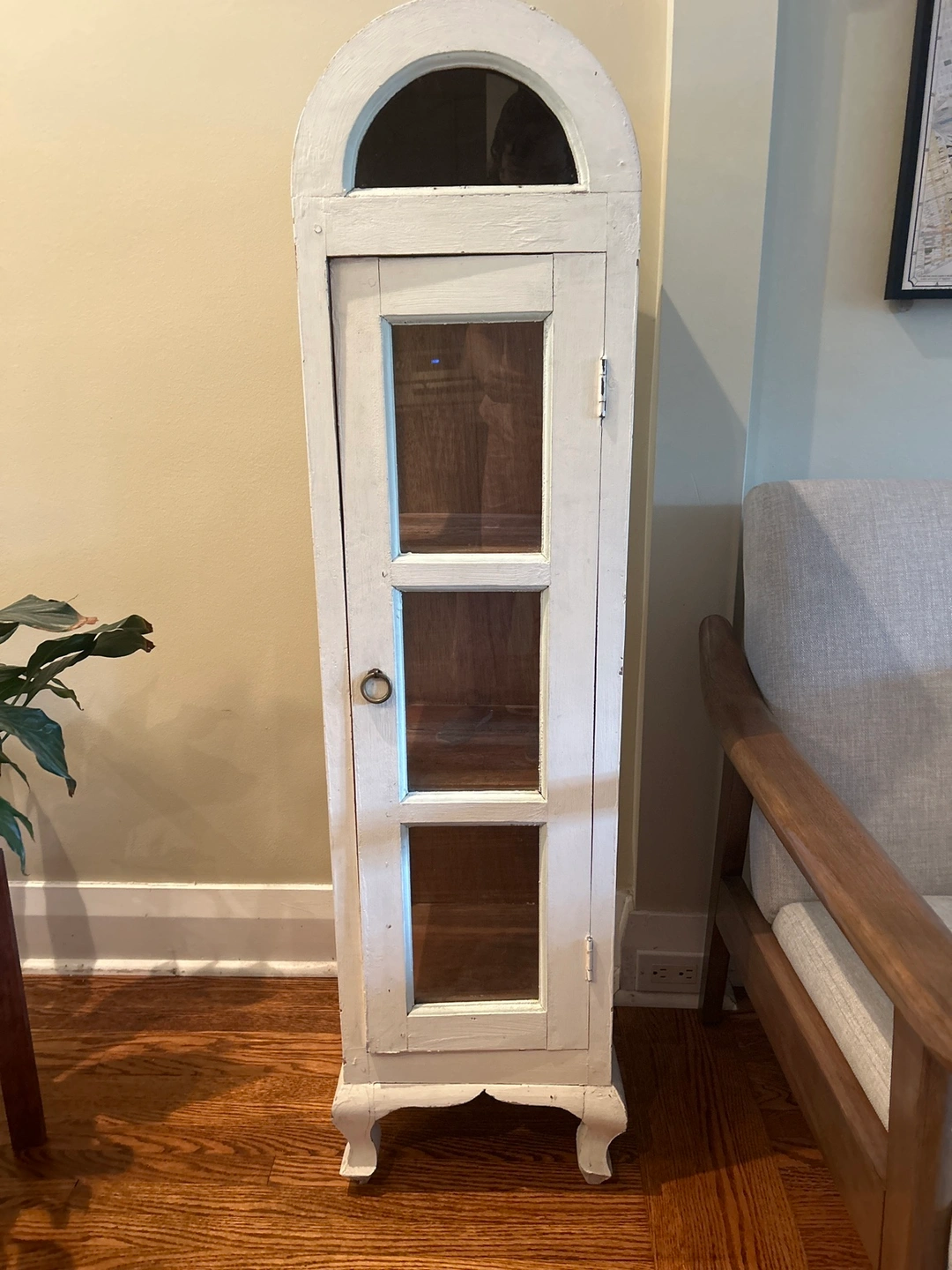 Add a touch of vintage charm to your home with this beautiful white wood cabinet. Featuring three glass panels on the door and an arched glass top, this piece is perfect for displaying collectibles, books, barware, or decorative items. The cabinet has three shelves and sits on elegant curved legs. It's a sturdy and versatile addition to any room, offering both style and functionality.