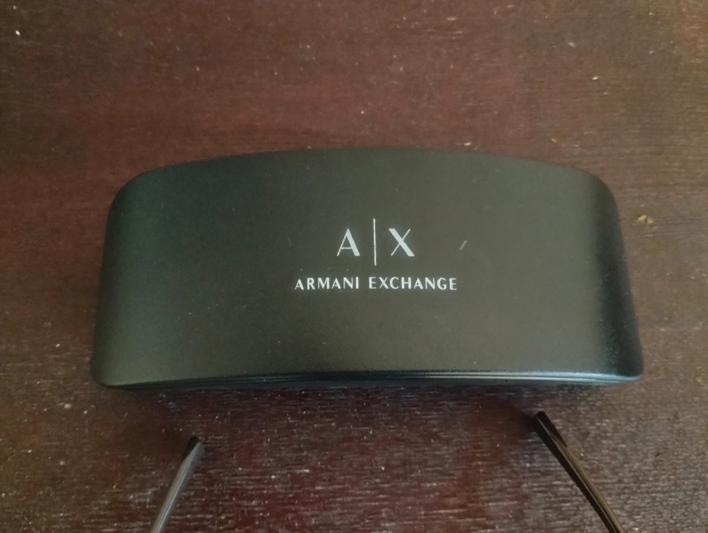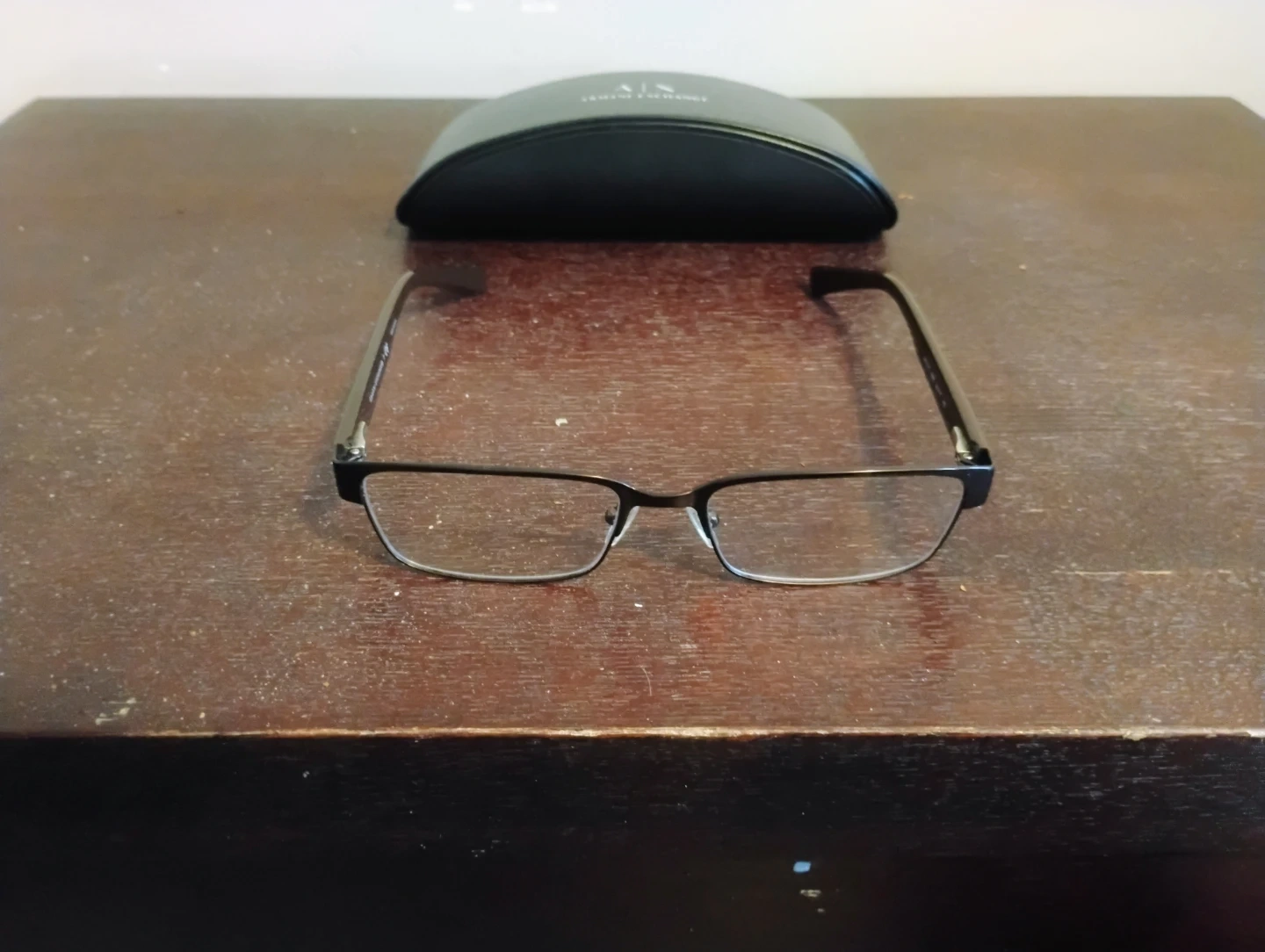 These are Armani Exchange eyeglasses with their original case. They have a modern rectangular frame design. The case features the distinct AX logo.