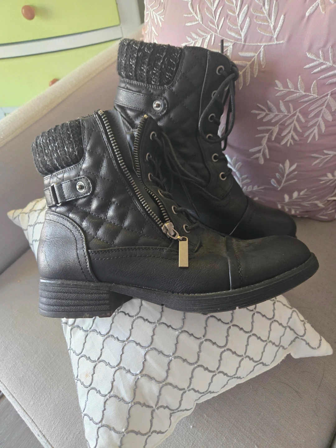 These black combat boots feature a stylish quilted faux leather design. They have a convenient side zipper and functional laces for a secure fit. The knit collar adds a cozy touch and extra warmth. Size is 7.5
