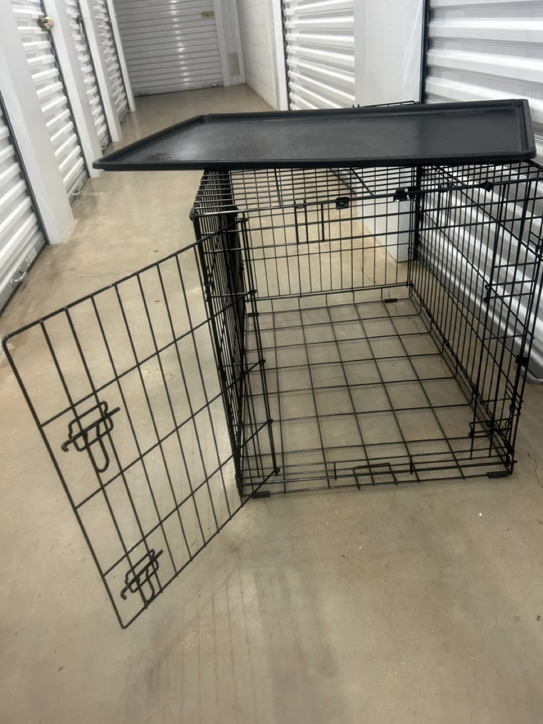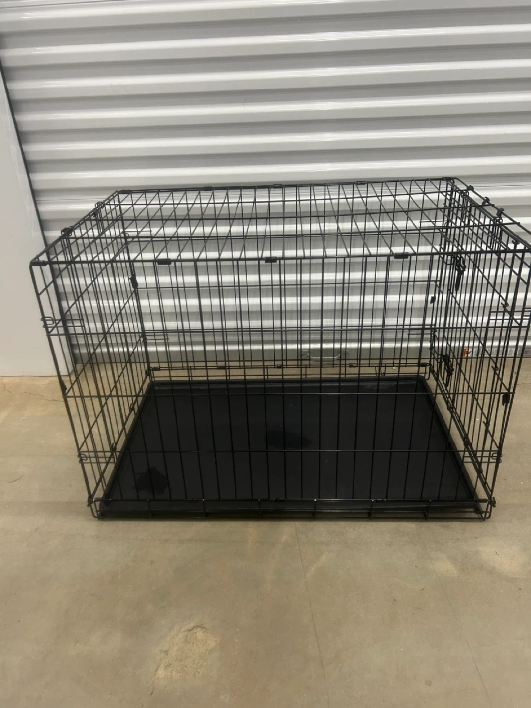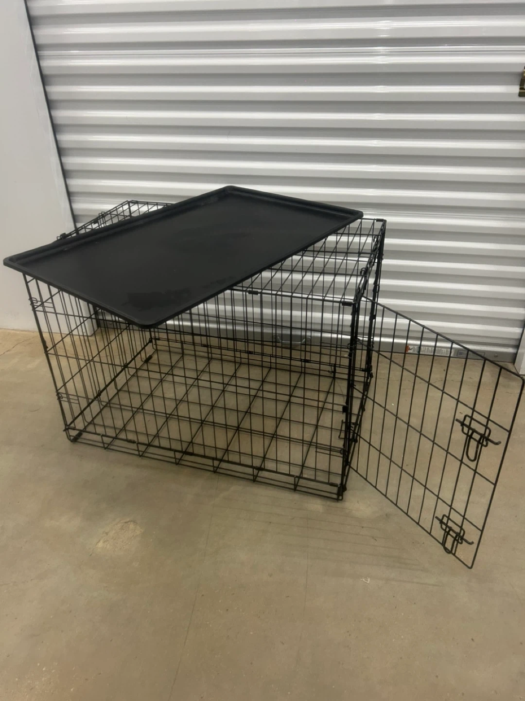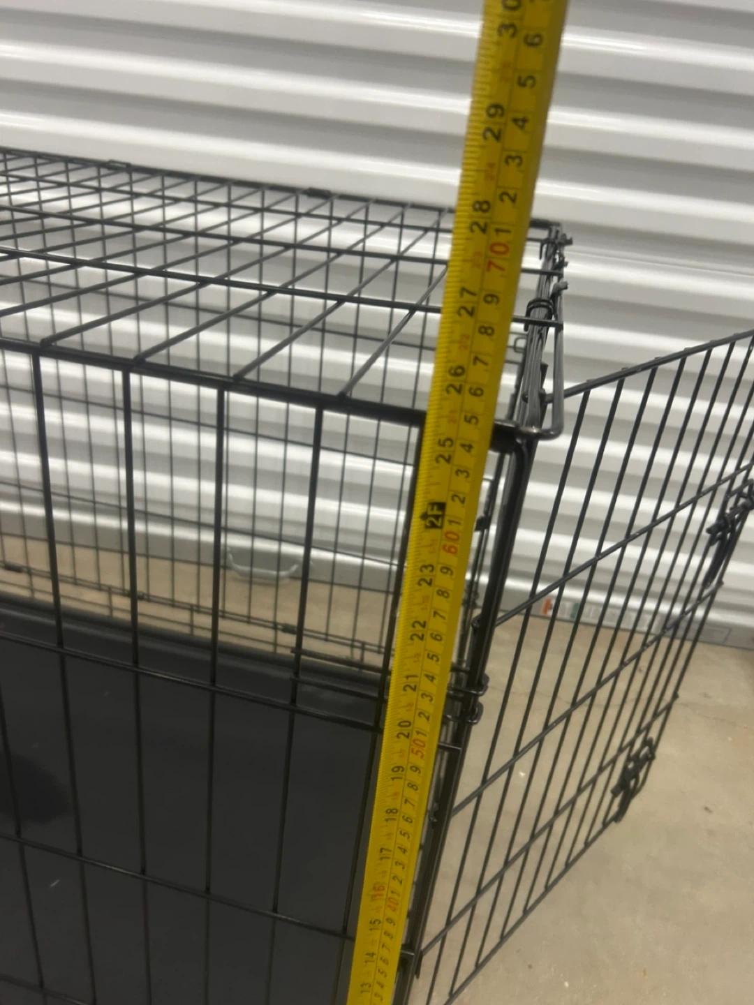 This is a sturdy black metal dog crate. It includes a durable plastic tray for easy cleaning. The crate measures approximately 30 inches long and 20 inches high. It's a great size for many medium to large dogs!
