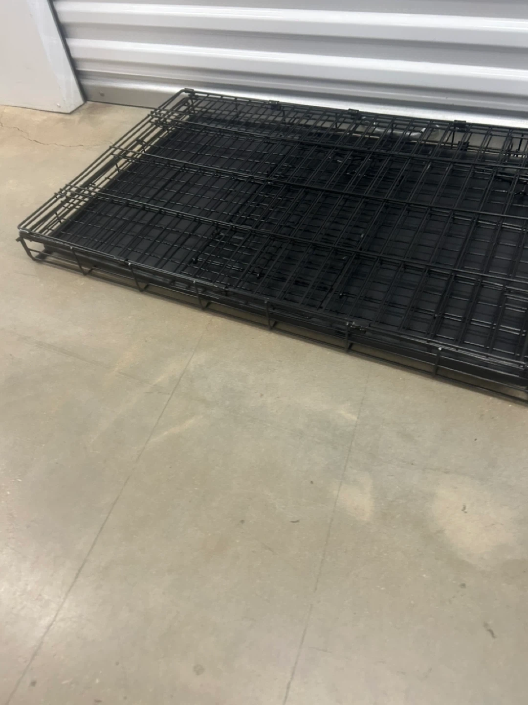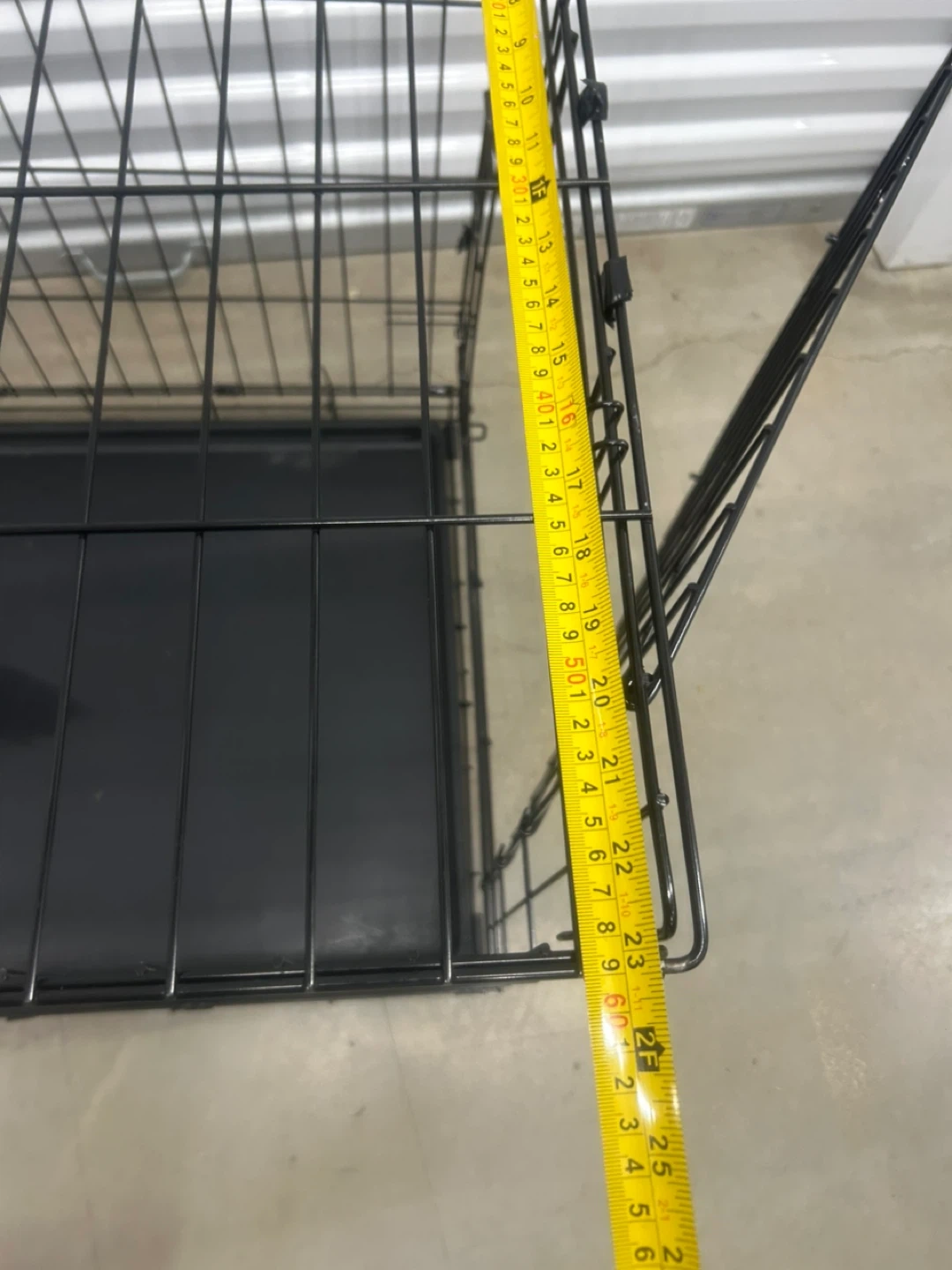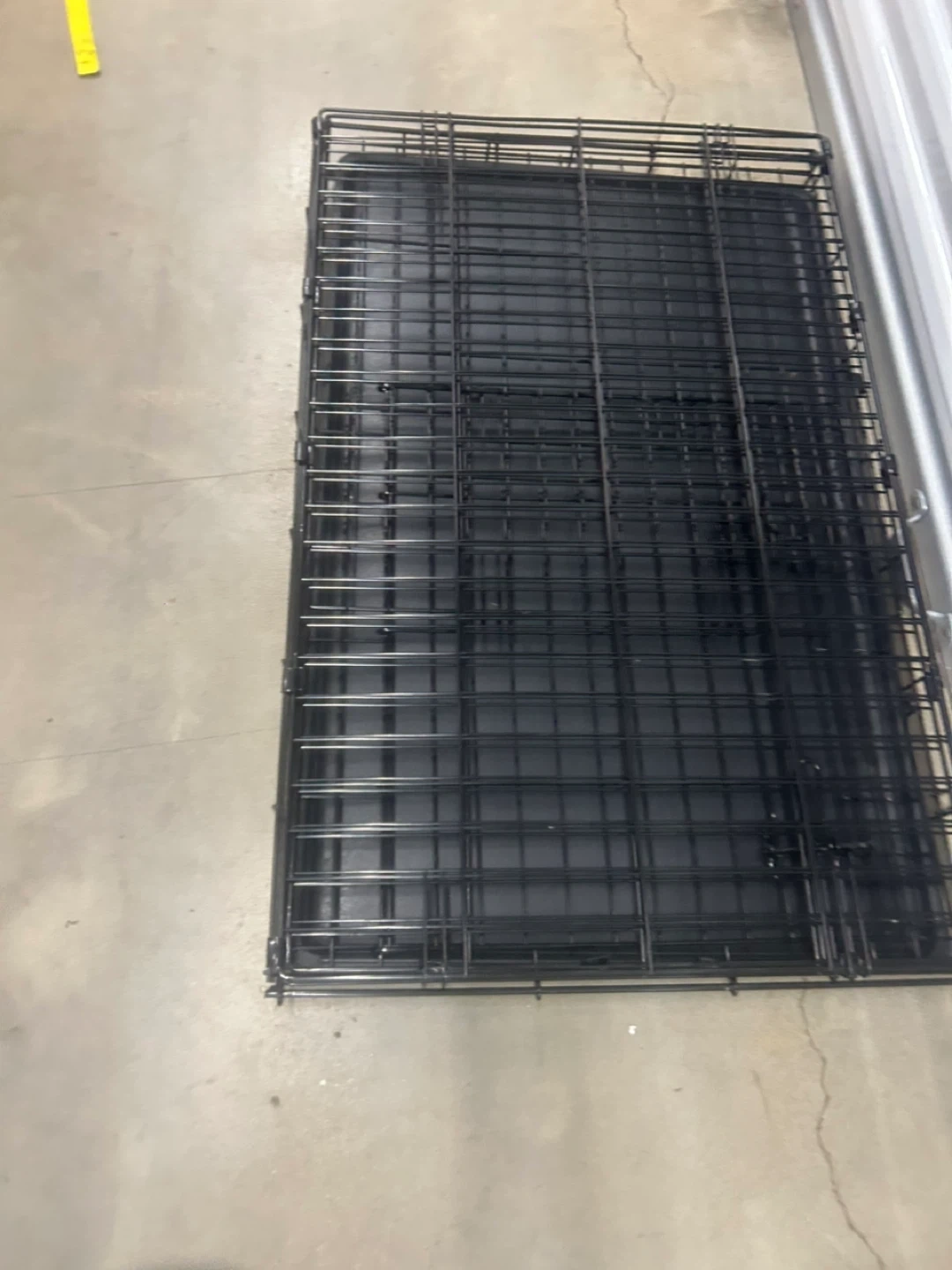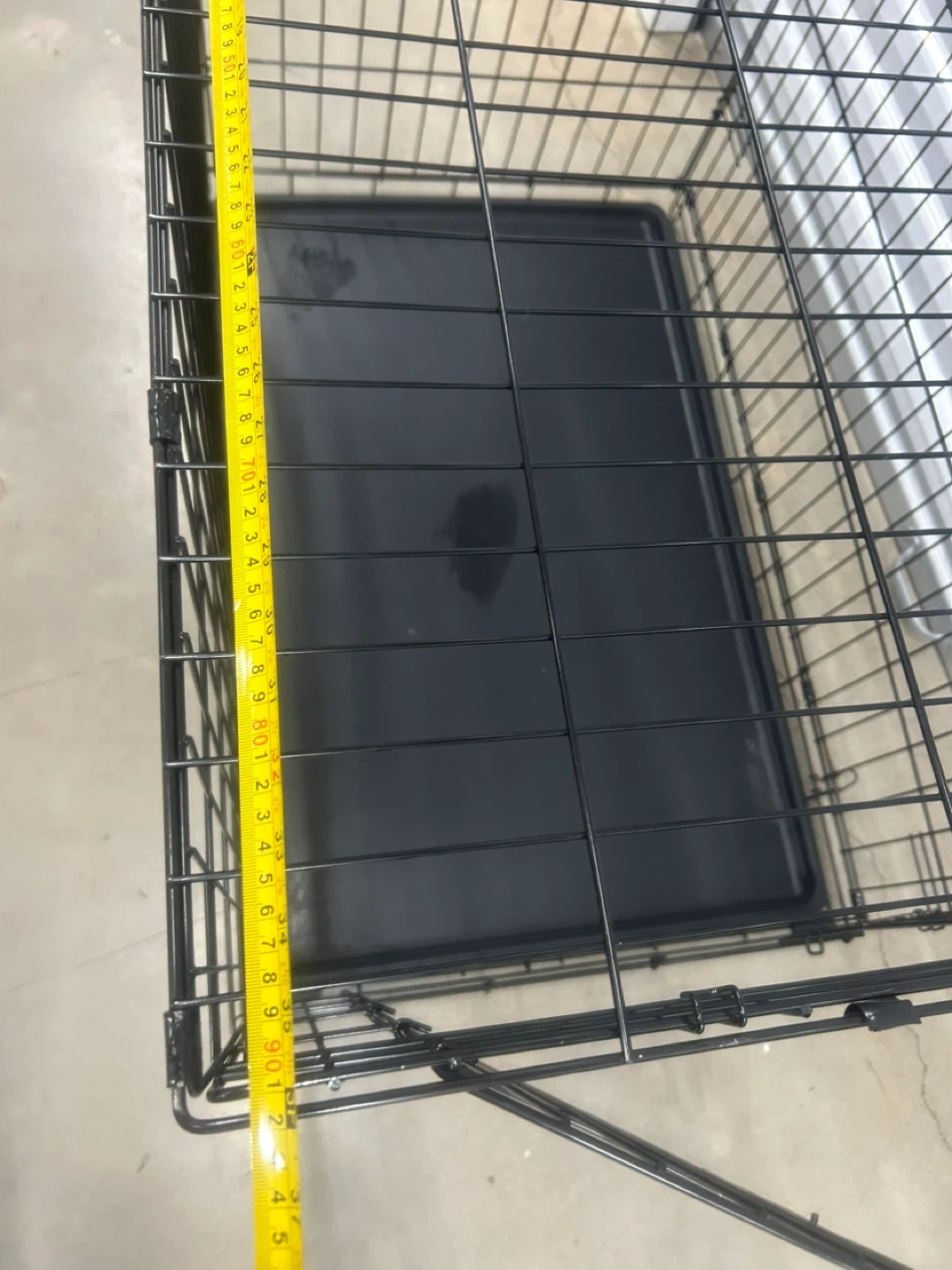 This is a sturdy black metal dog crate. It includes a durable plastic tray for easy cleaning. The crate measures approximately 30 inches long and 20 inches high. It's a great size for many medium to large dogs!