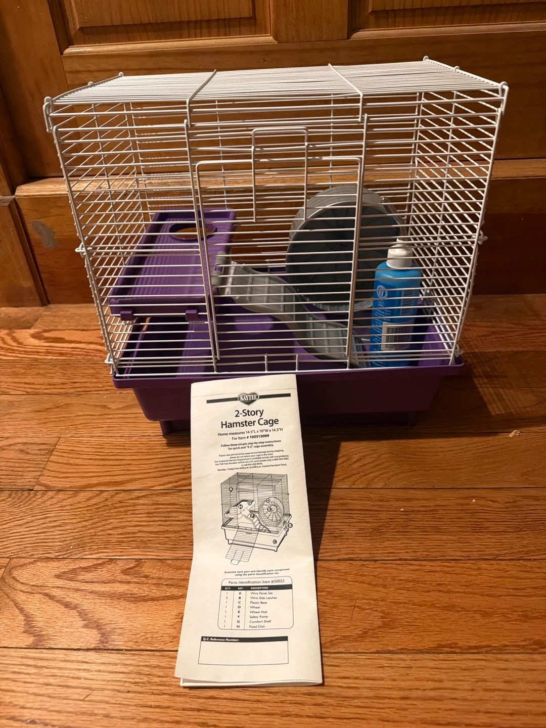 Kaytee 2-story hamster cage. Home measures 14.5"L x 10"W x 14.5"H. Includes wire base, plastic base, wheel, tubes, safety ramp, comfort shelf, and food dish. This cage is suitable for hamsters.