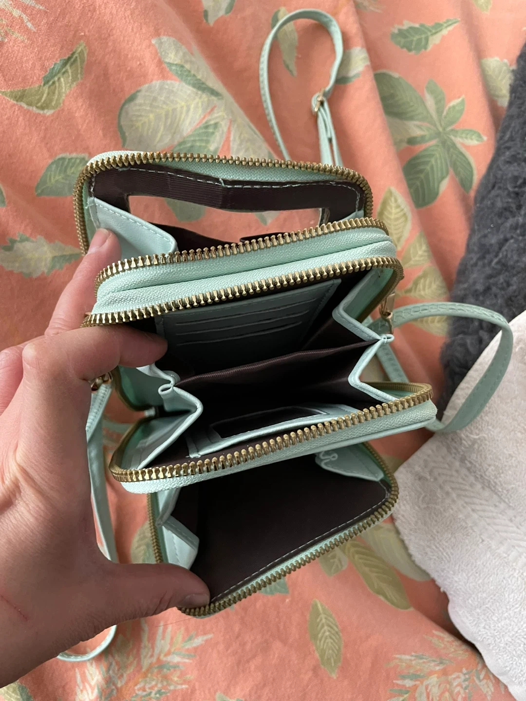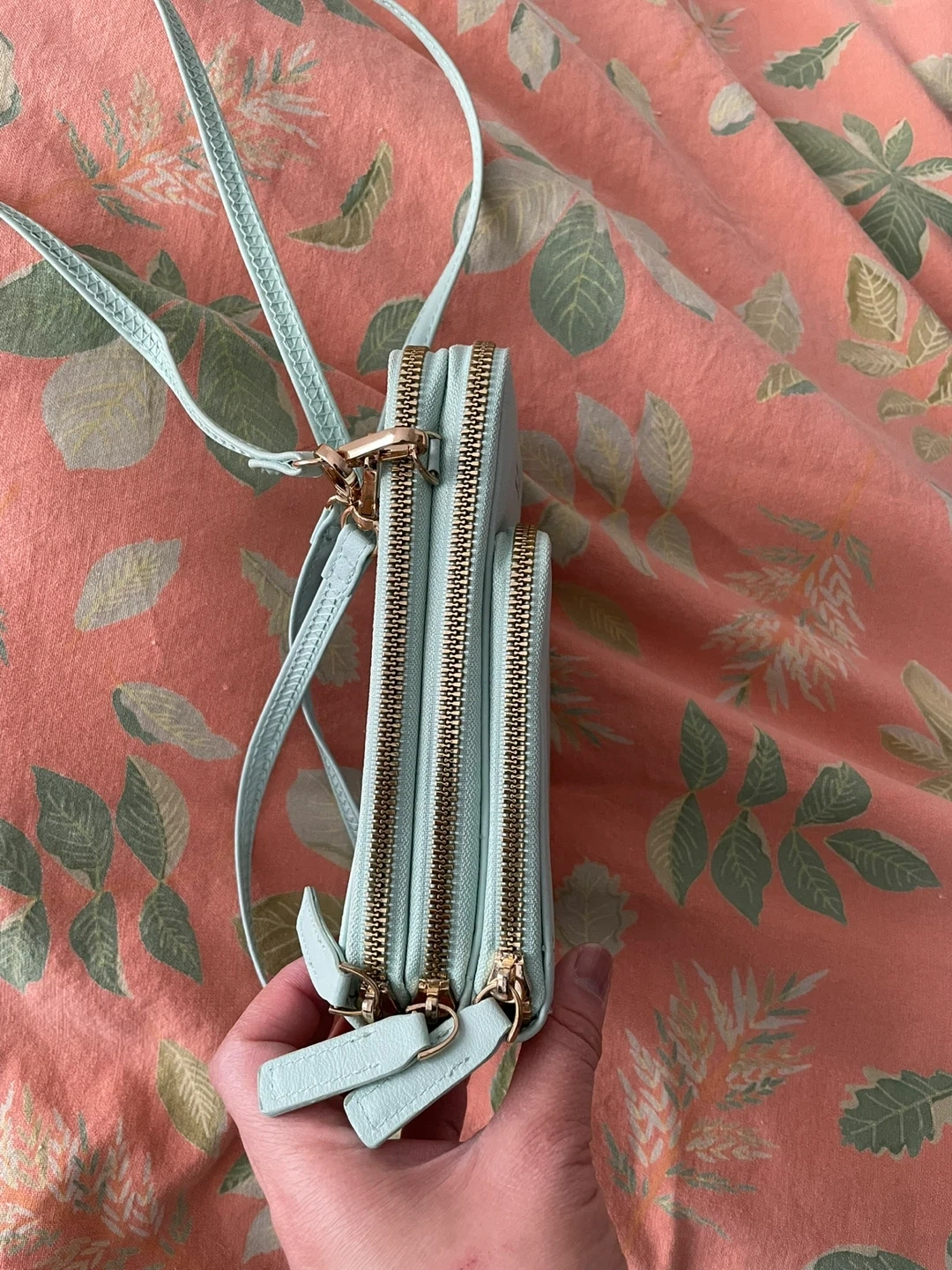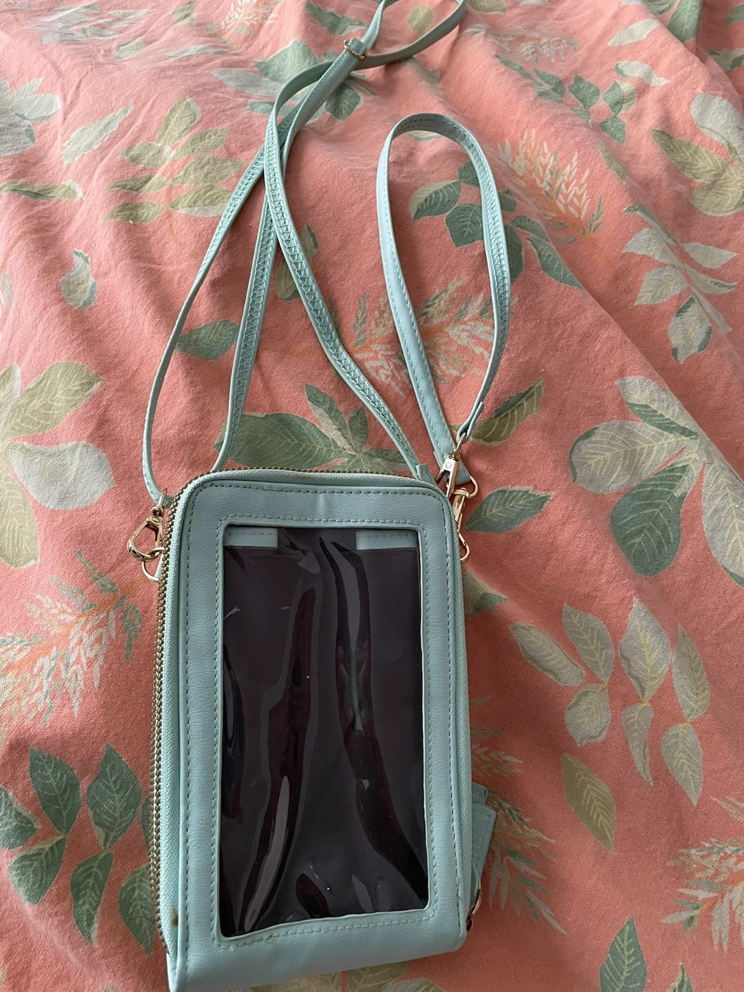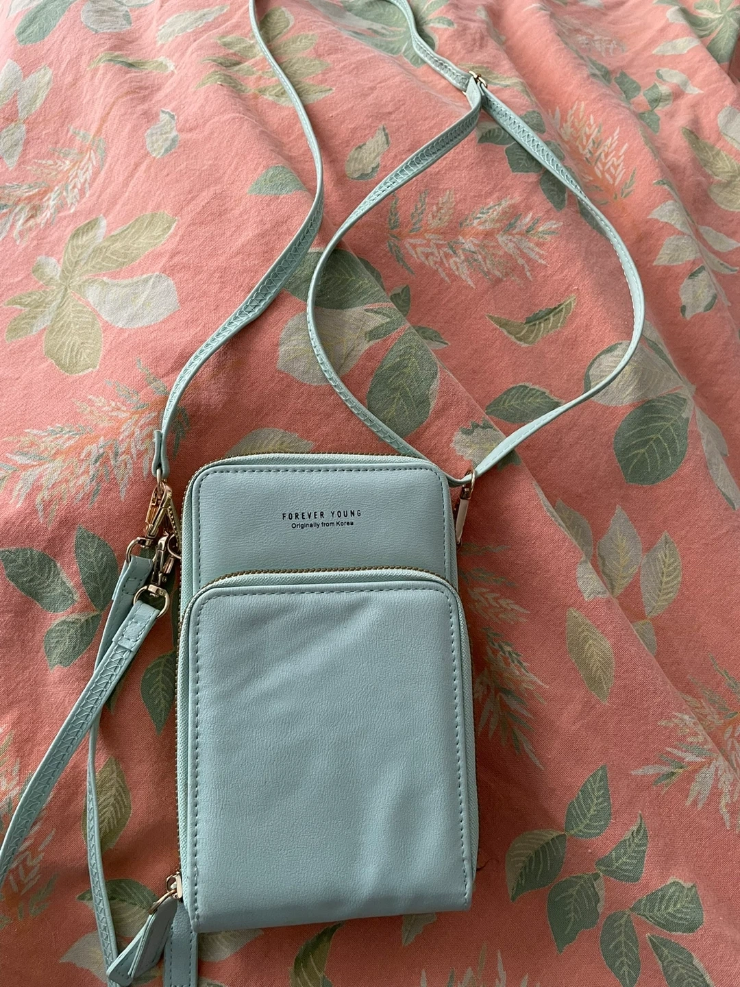 Made in Korea. Like New. No tags.This light blue crossbody bag is from Forever Young. It's designed to hold your phone and has multiple card slots. The bag features a clear window for touchscreen access!!