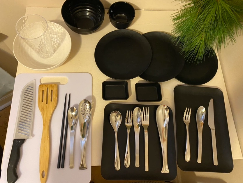 This set includes plates, bowls, a serving spoon, chopsticks, etc. All from Japan except board knife and spatula