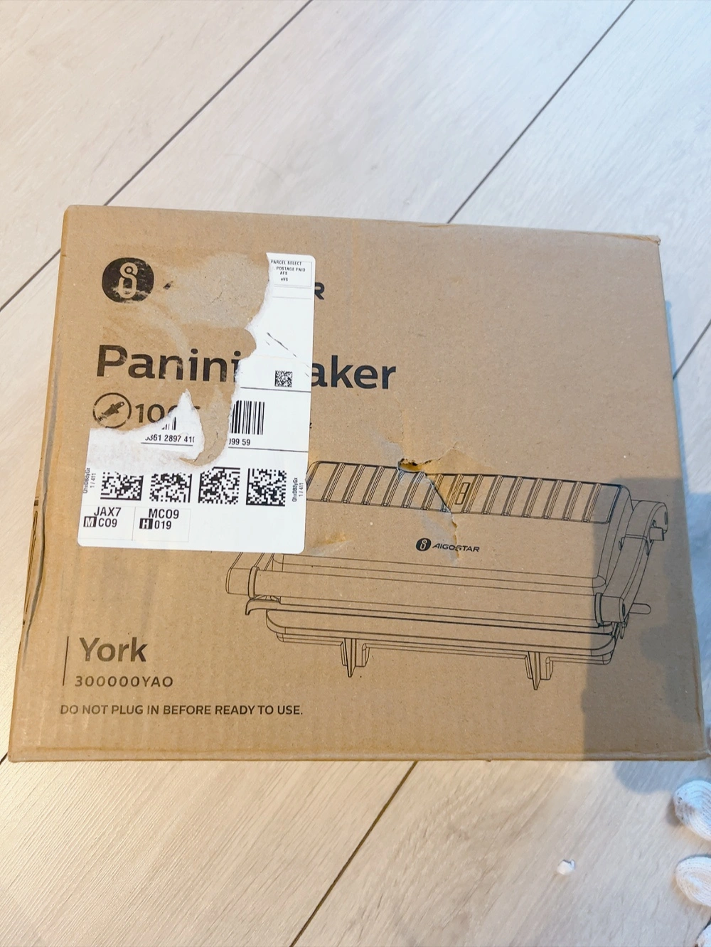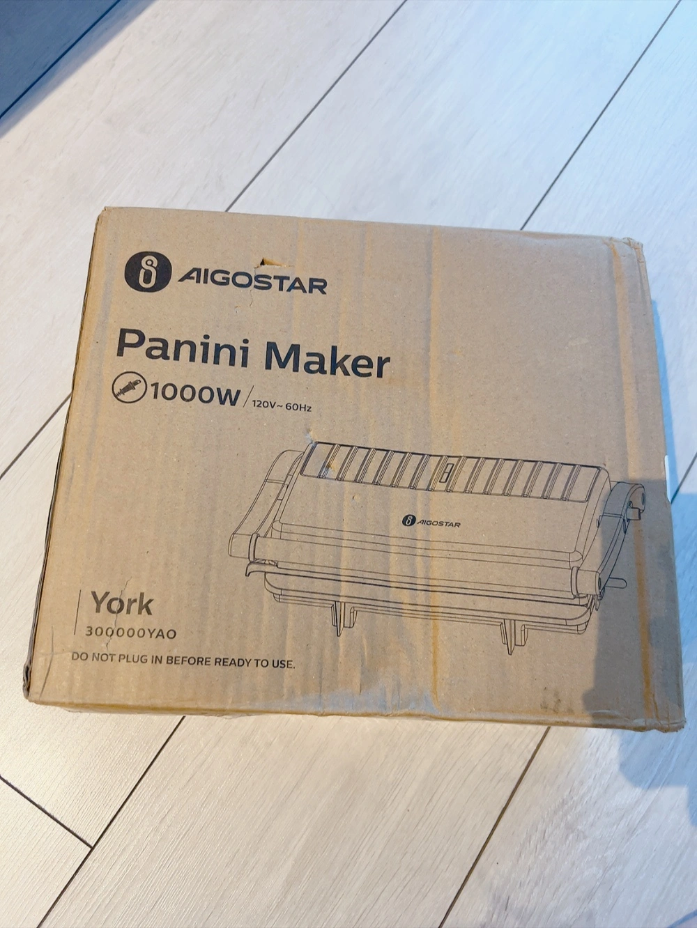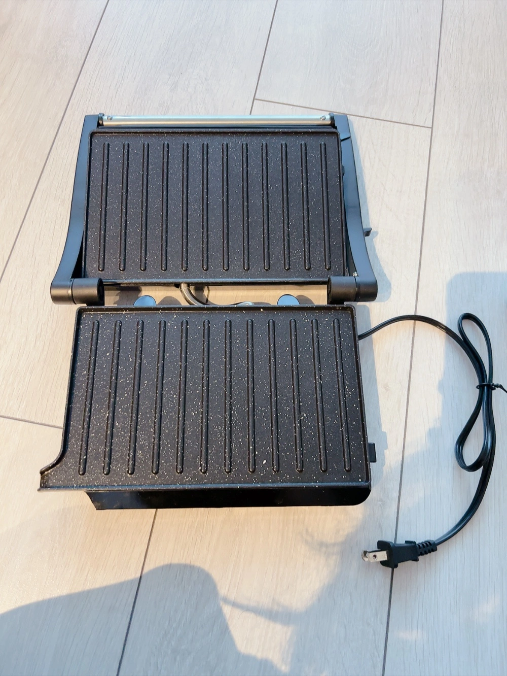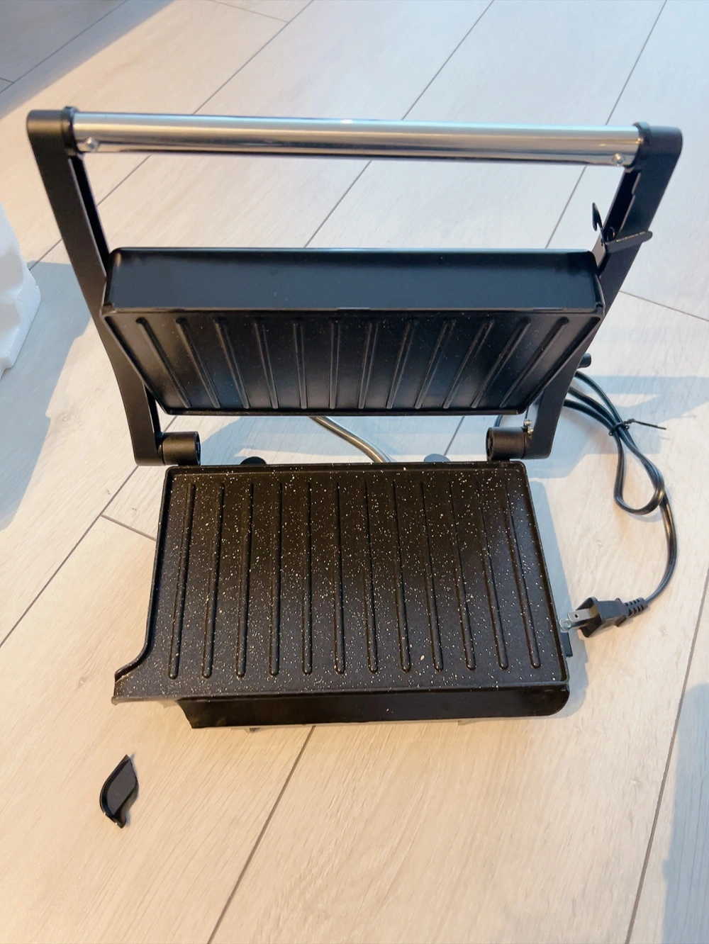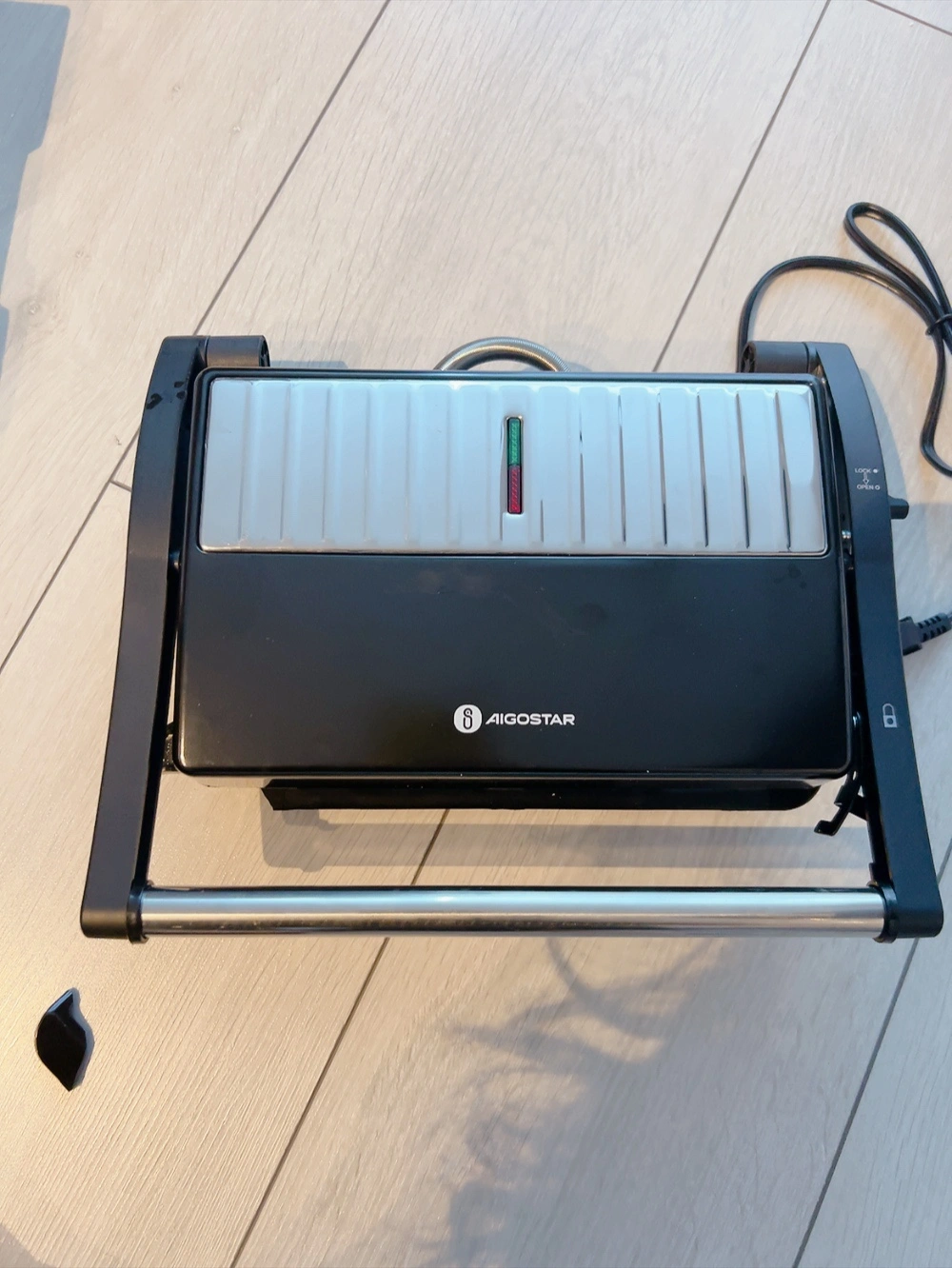 Never used but hit somewhere, the left bottom side plastic part is broken It doesn’t affect for grilling, Still working perfectly ! Panini Press Grill, Sandwich Maker with Double Non-stick Plates, Opens 180 Degrees with Floating Hinge for Any Size Food, Indicator Lights, 3-in-1 Electric Indoor Grill by Aigostar Amazon link https://a.co/d/2KYWdSW