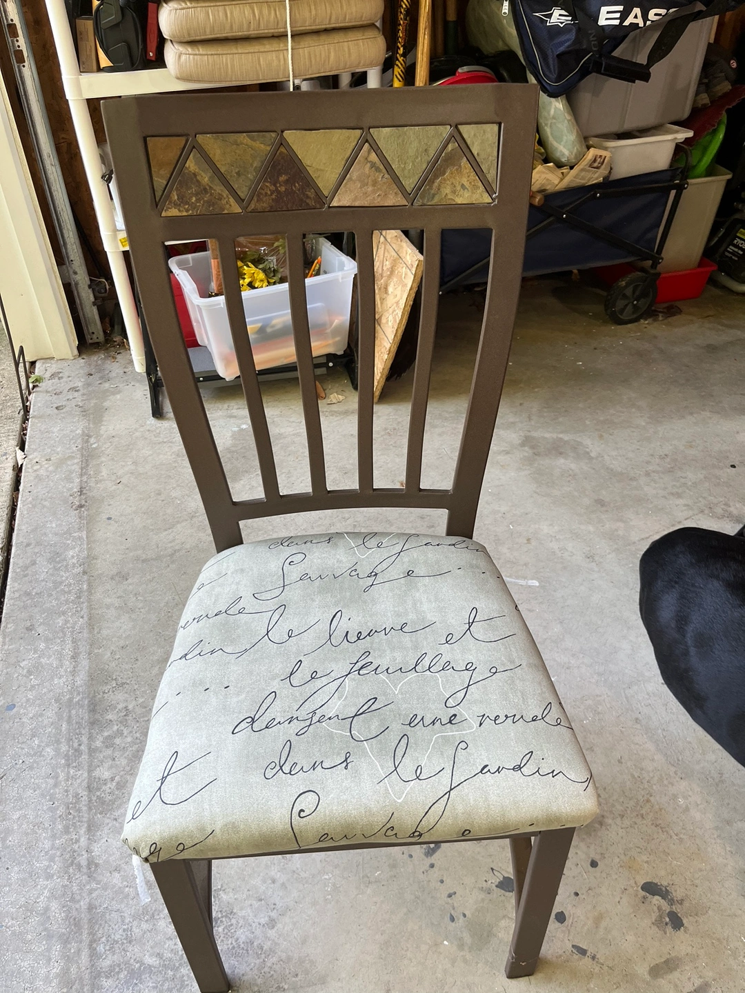 This chair features a metal frame, a cushioned seat with a decorative design, and a stone inlay on the back. Very soft comfortable chair.
