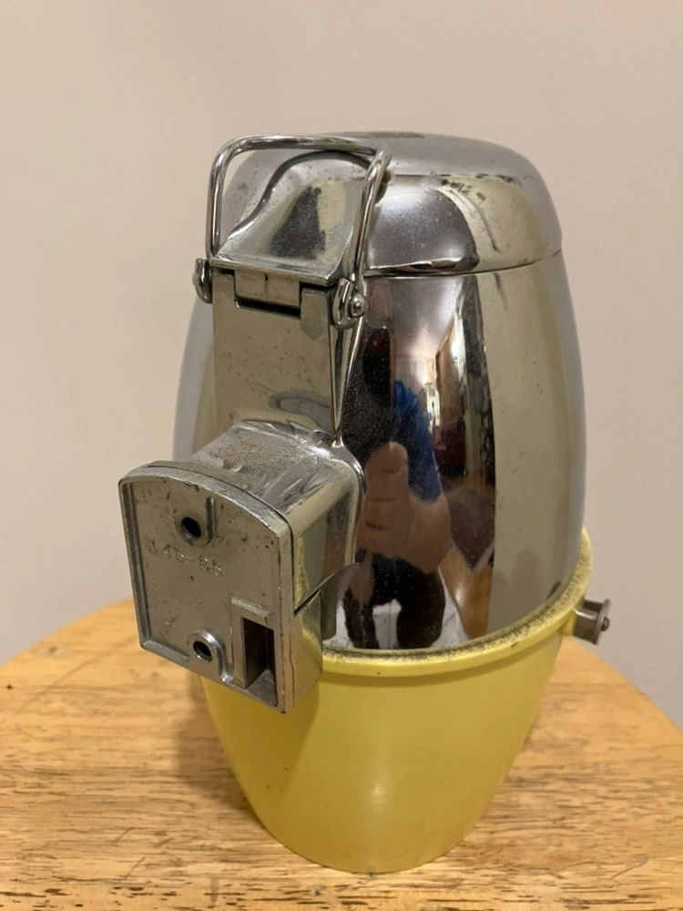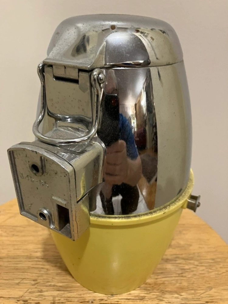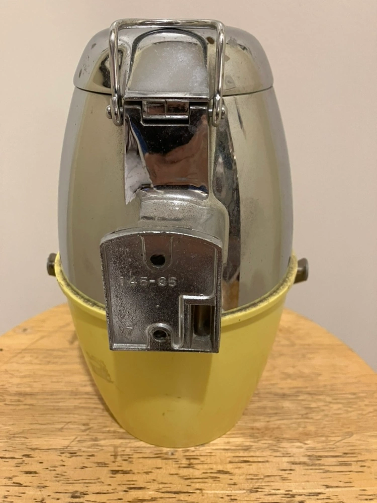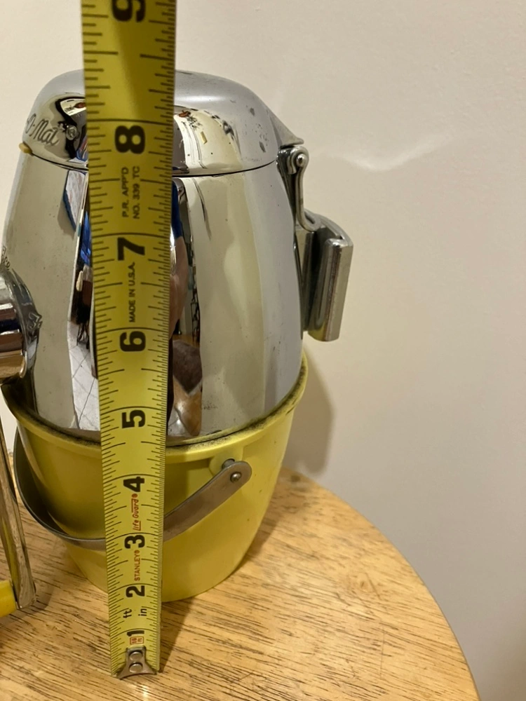 Vintage Ice-O-Mat ice shaver in yellow and chrome. It is approximately 8 inches tall and includes a removable bowl. It appears to be in good condition, but could benefit from a good cleaning.