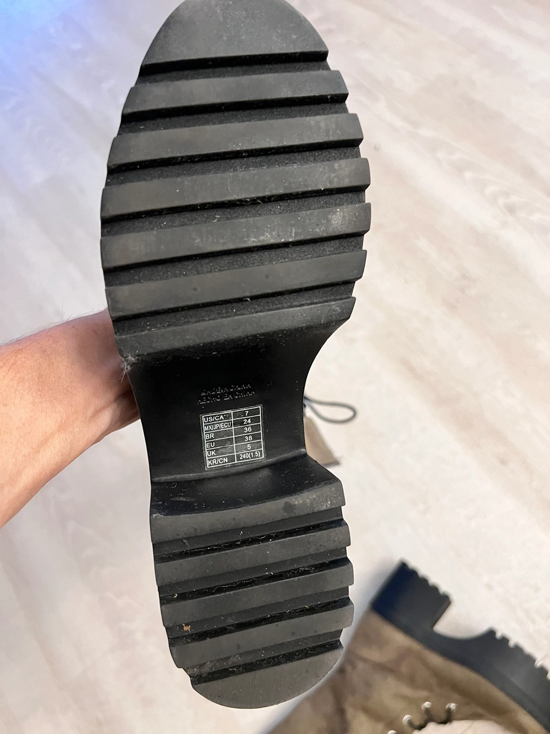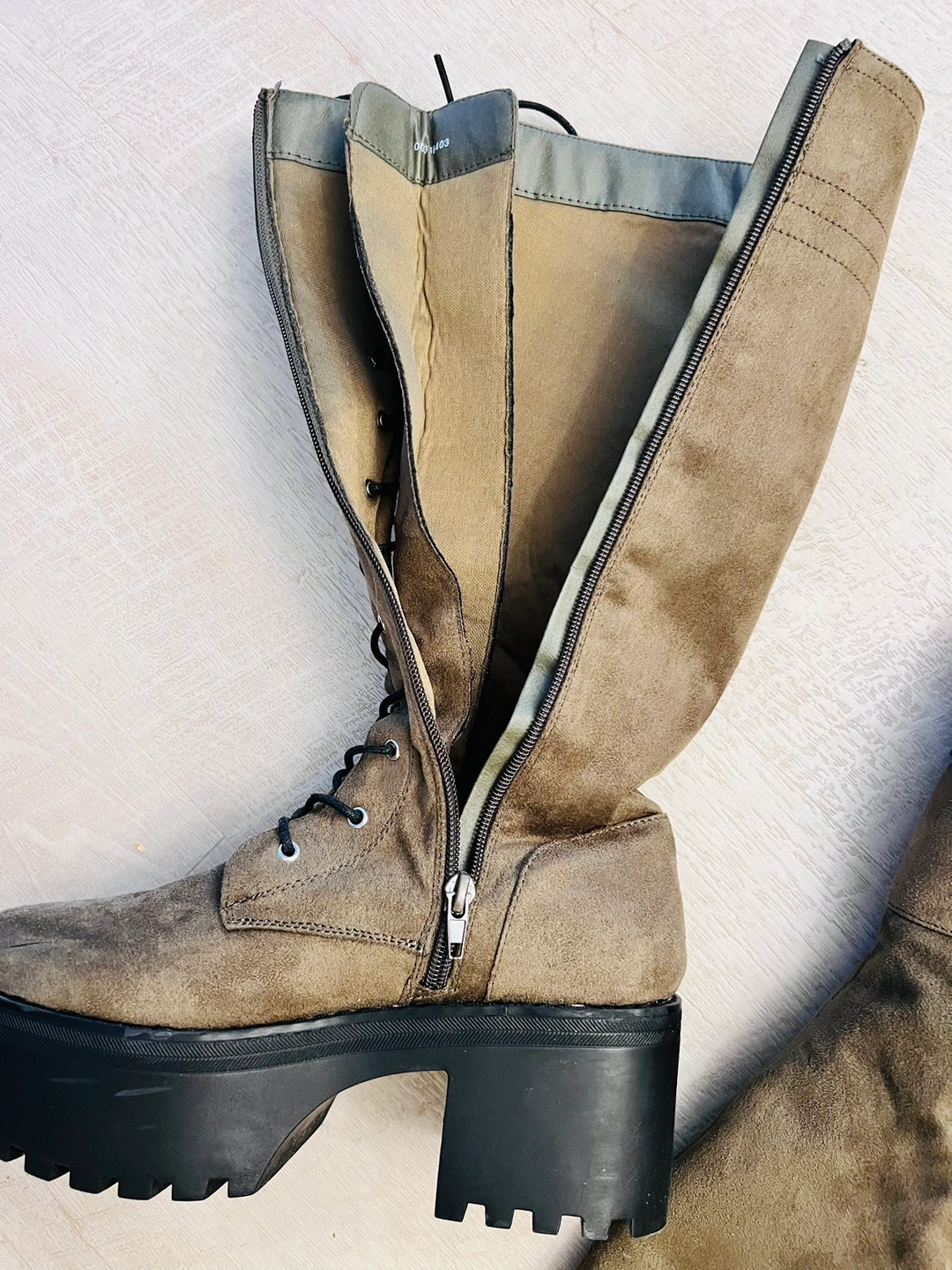 These knee-high boots have o my been worn 2x as you can see from the perfect bottoms and size sticker on the bottom. They are 16 inches high(goes to my knee) and are a size 7 and they are a dark khaki/light brown colour. Great for spring and fall weather! Asking $40 or best offer!
