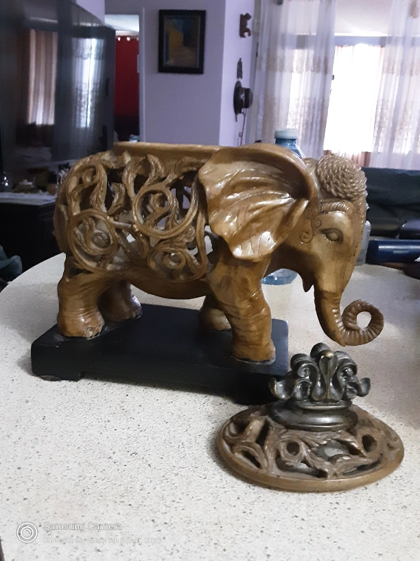 1000+This is a beautiful carved elephant statue with a removable lid. It stands on a black wooden base.