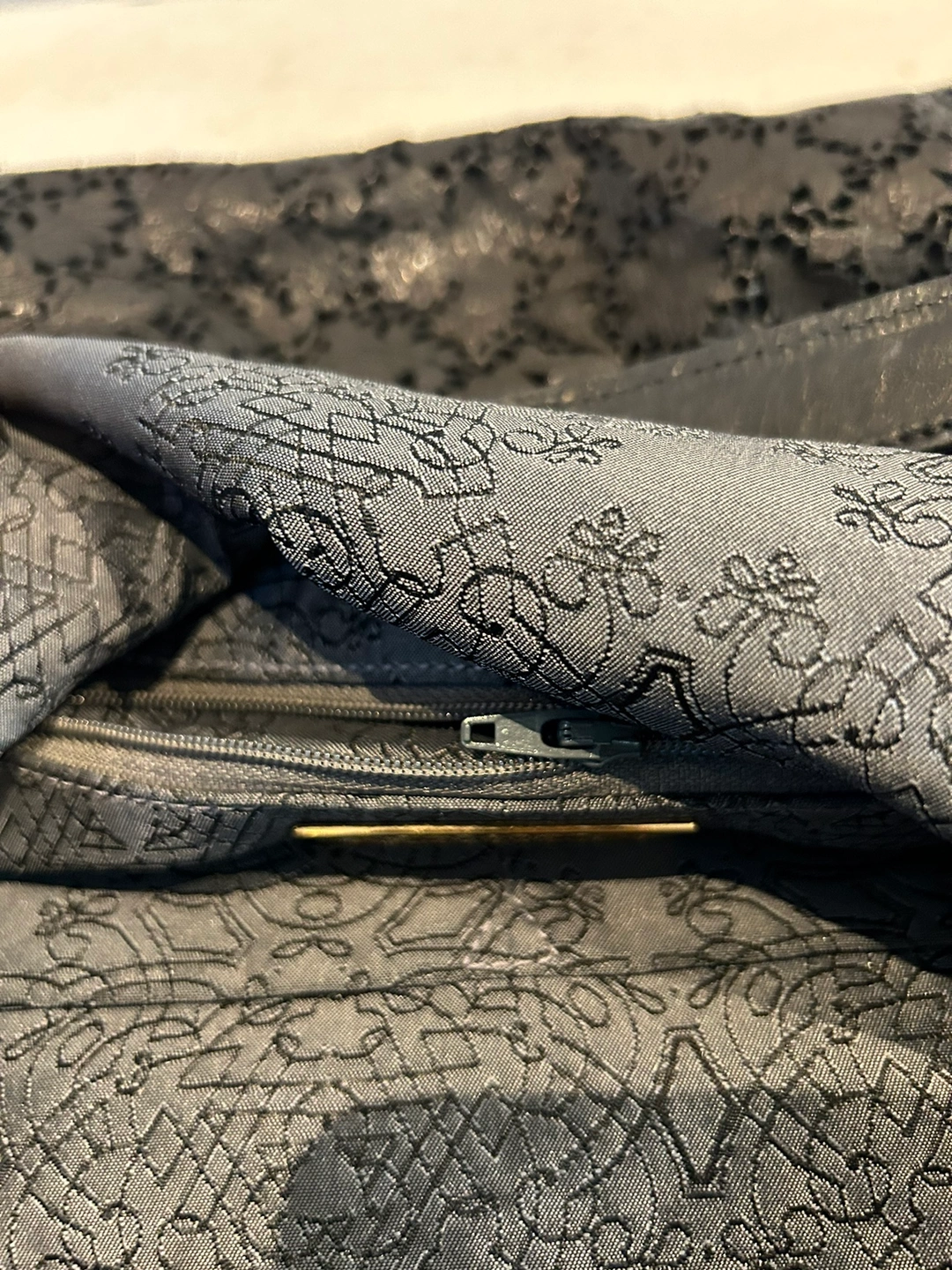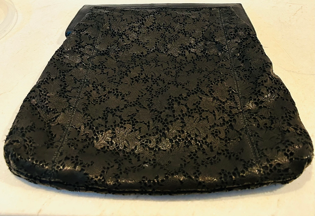 New without tags black leather lace design folding clutch bag from Augustina. The pattern is so beautiful. Looks like leather & lace. Very elegant. Magnetic closure. Can wear as large or a folder smaller clutch. Interior is pristine. With augustina logo and an interior zippered pocket. Augustina is a very elegant high-end Toronto based accessories boutique