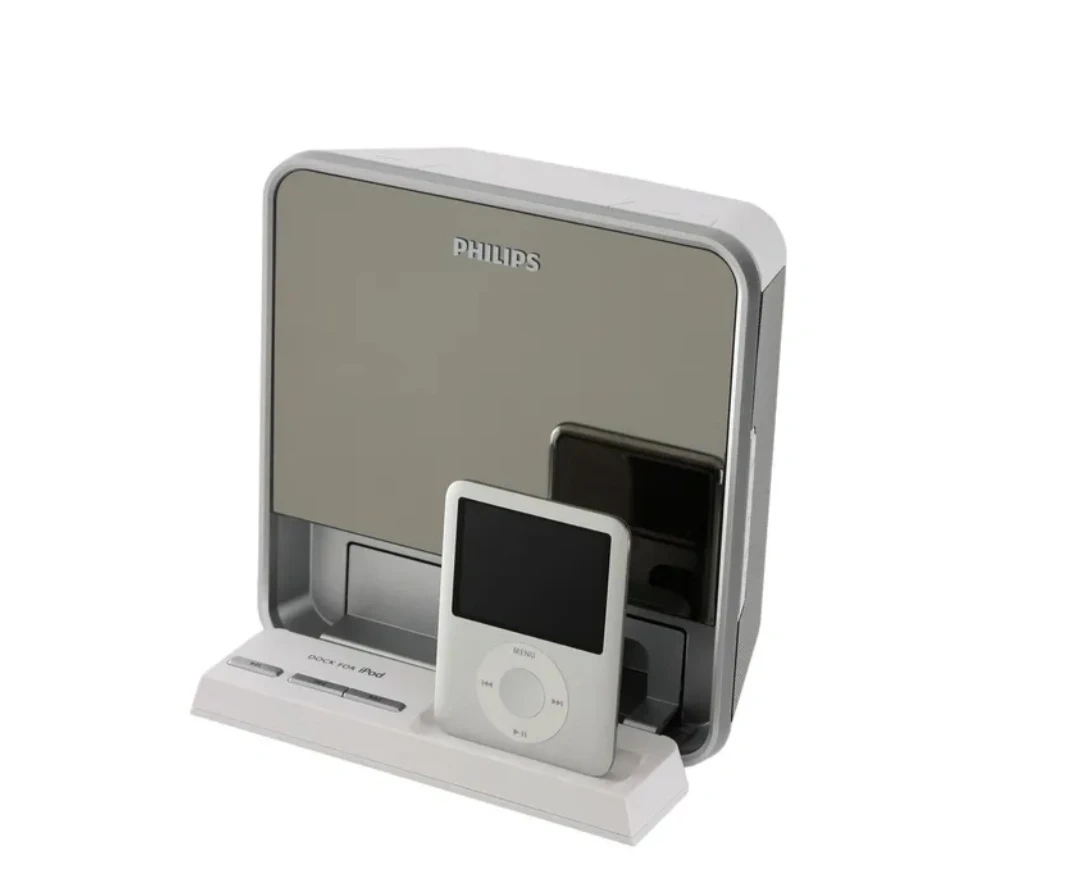 Clock radio with iPod docking station, alarm clock and FM radio.