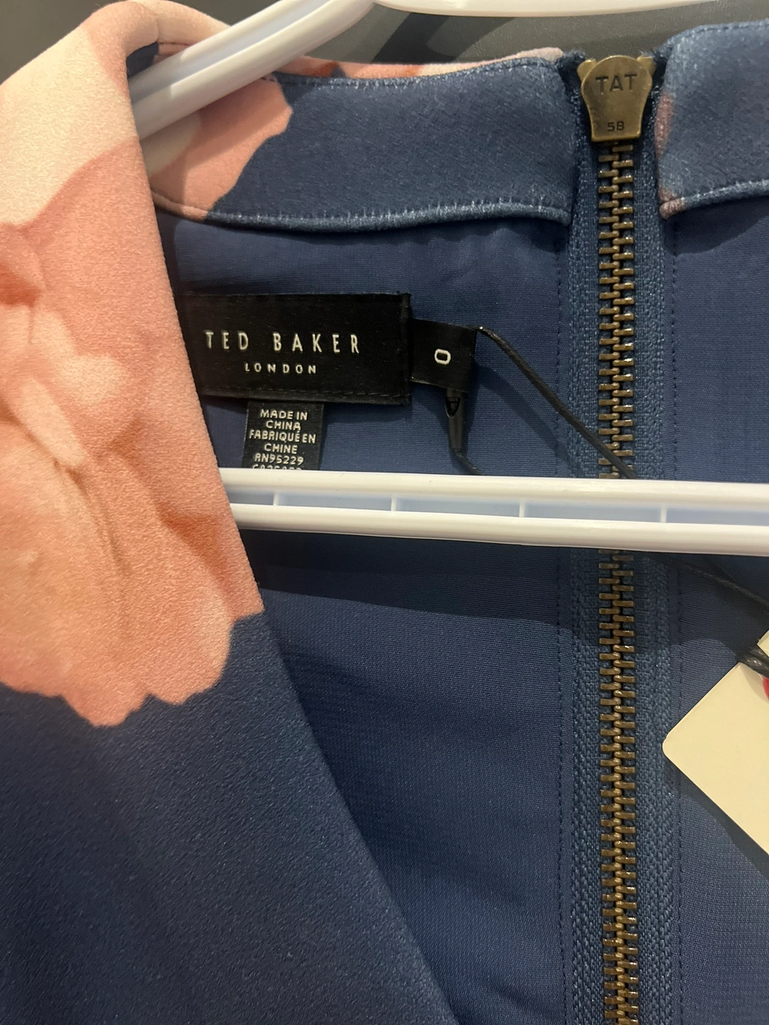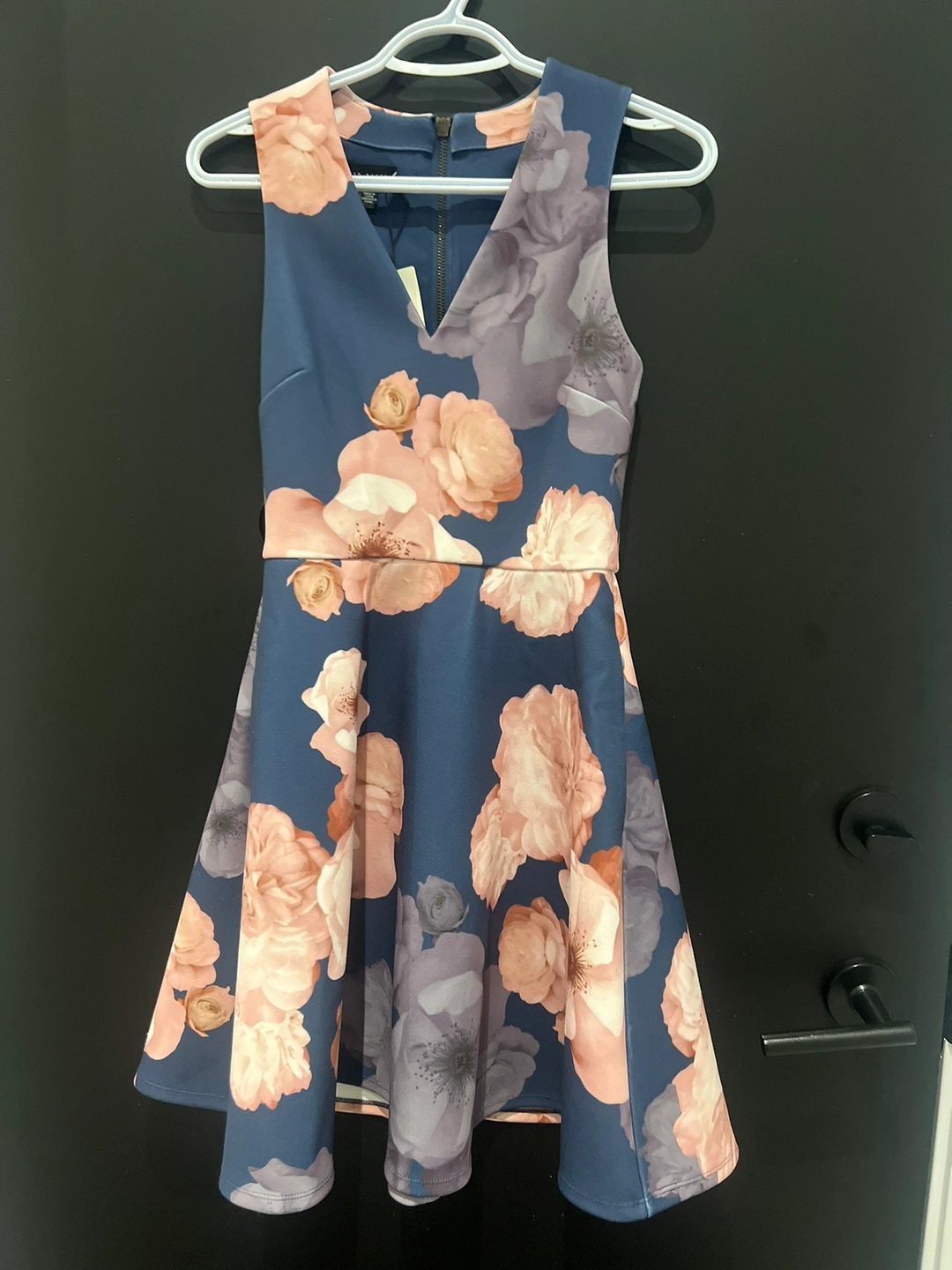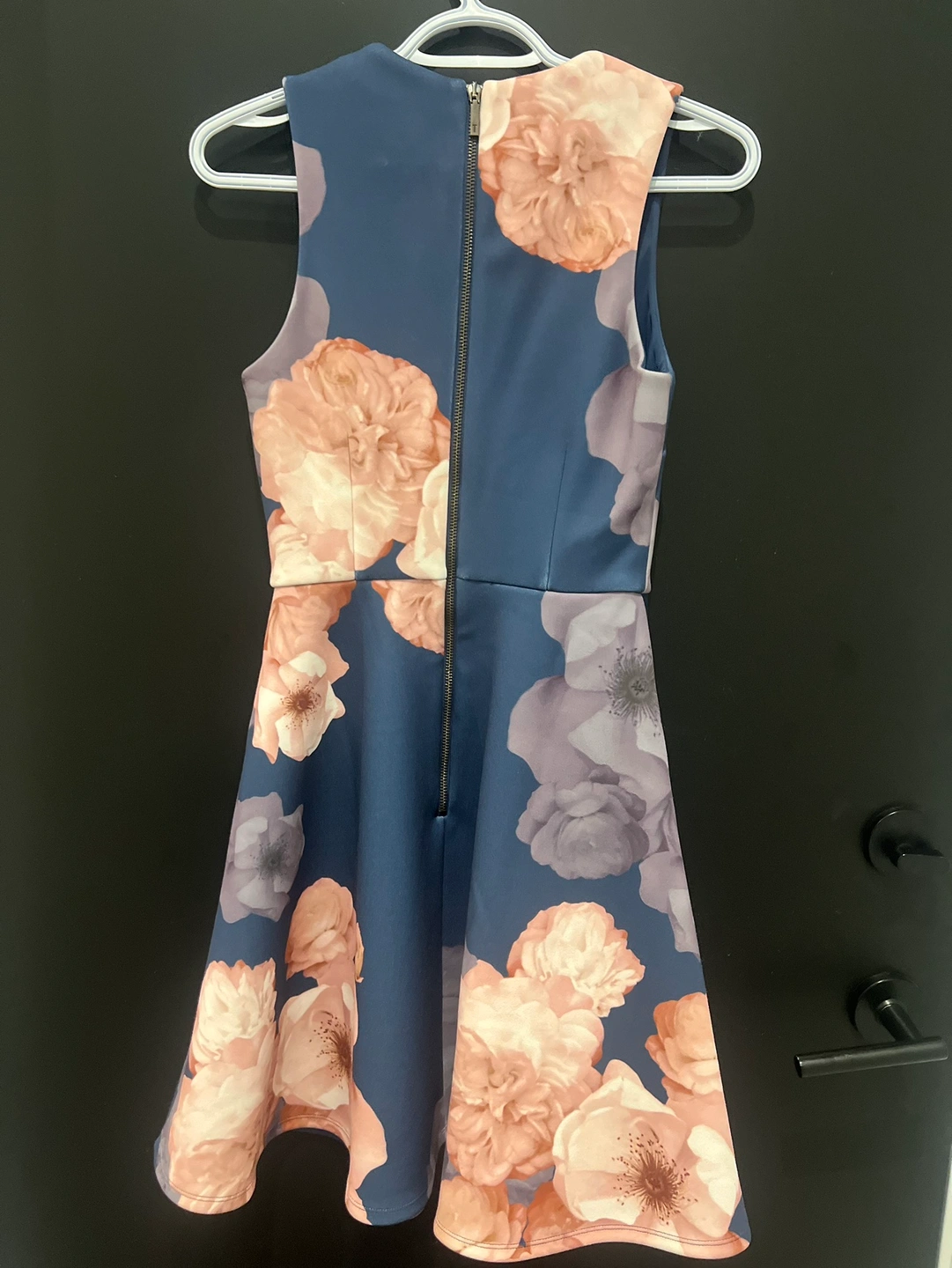 Size 0, sleeveless, blue, floral print, gold zipper and I never wear it .