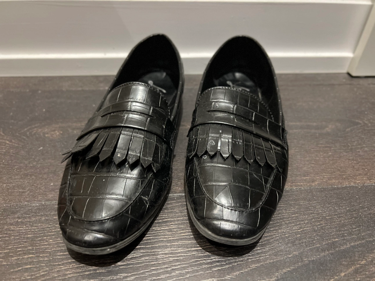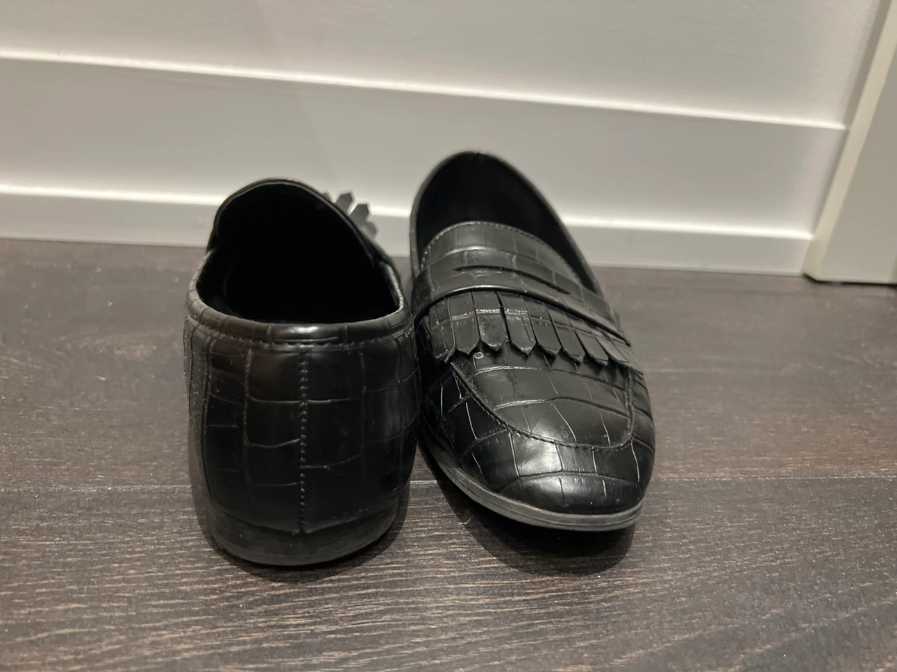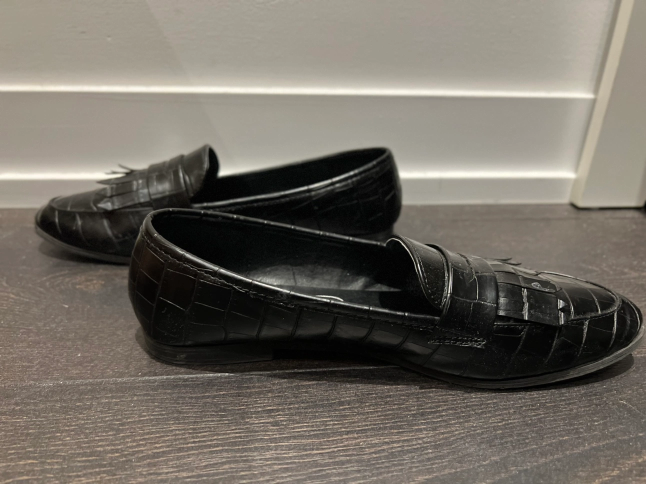 Black faux leather loafers with a tassel detail. They are a size 8. They have a comfortable fit with a low heel. The shoes are in good condition, with some light wear.