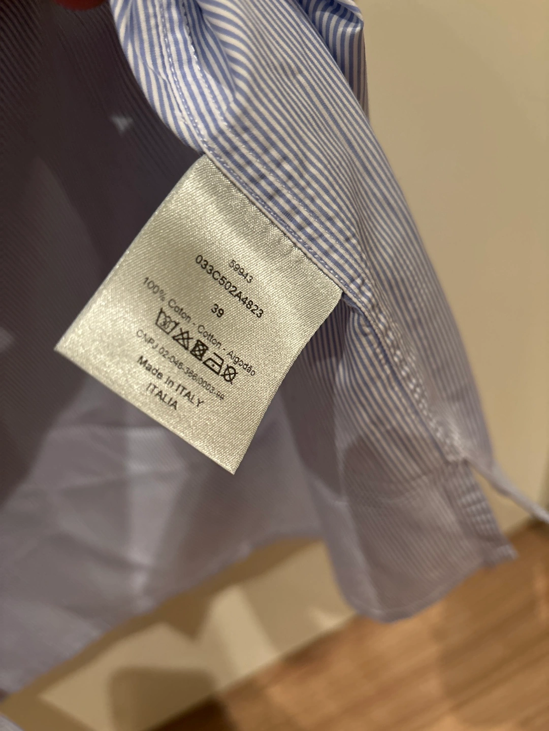 Blue and white striped short sleeve button-up shirt with a large Air Dior logo on the chest. The shirt has a standard collar and button cuffs. Worn just once. Rare collaboration.
