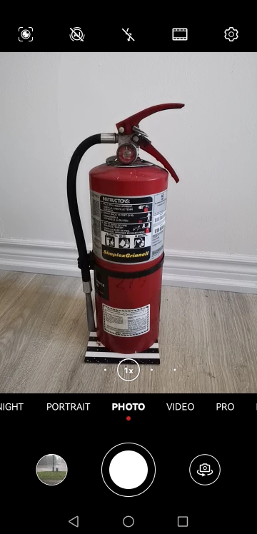 Red fire extinguisher with a black hose and a metal handle. The extinguisher has labels and instructions. Any questions please let me know