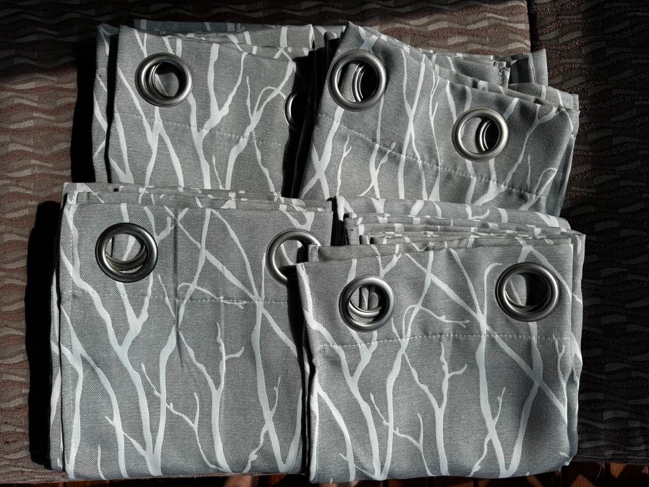 2 sets of unused, brand new condition grey curtains with a white branch pattern & silver grommets.