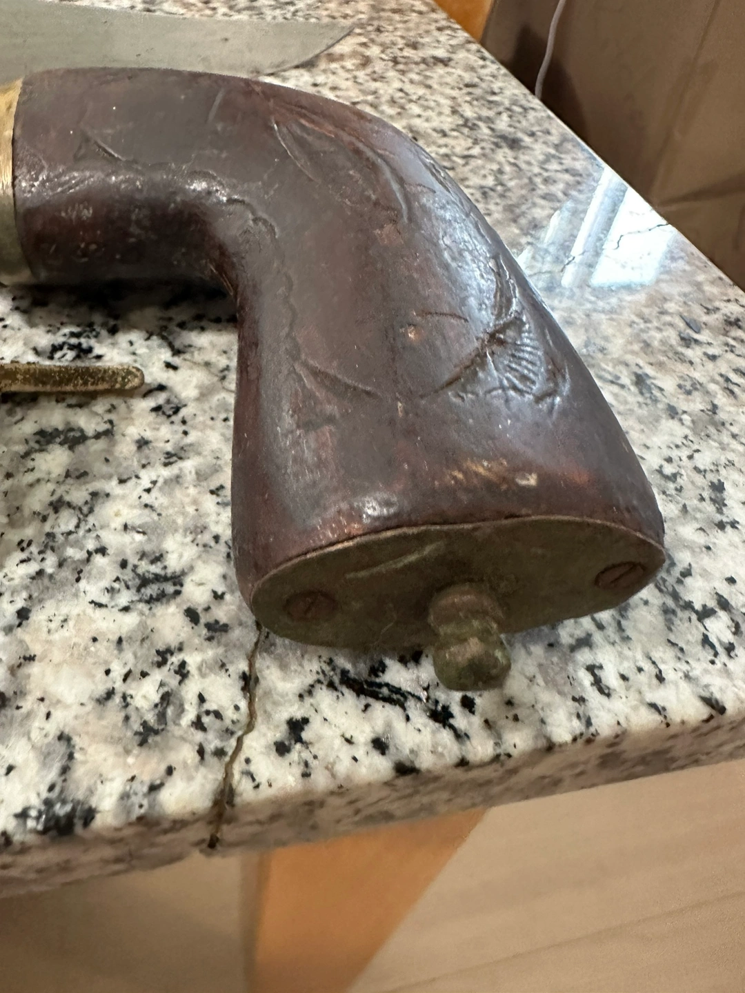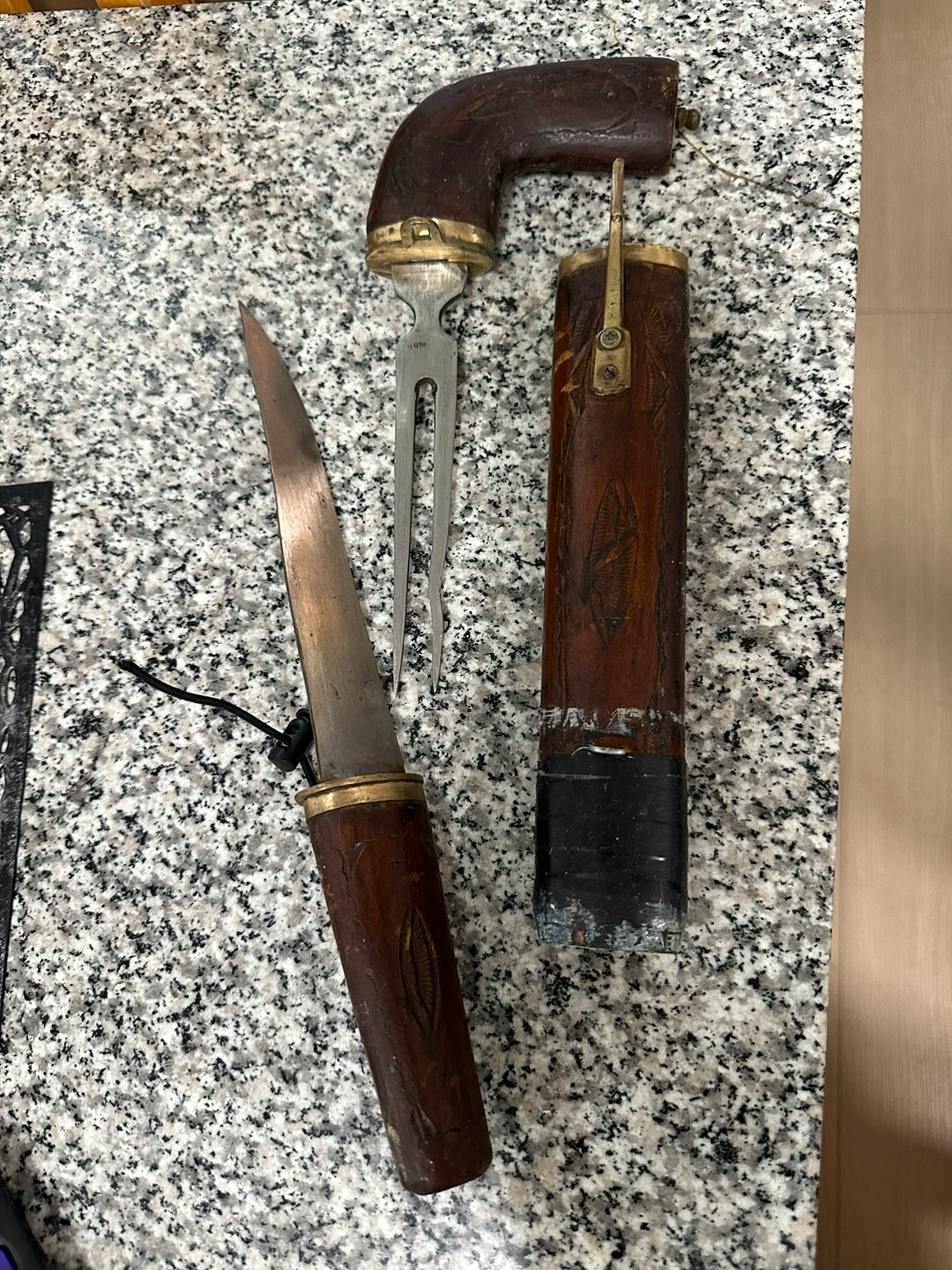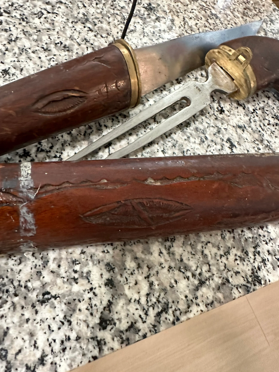 A vintage carving set with a knife, fork, and sheath. The sheath is made of wood and has a carved design. The knife has a wooden handle and a metal blade. The fork has a wooden handle and a metal fork. The set is in good condition and is ready to be used. Case little damage pick up thank you