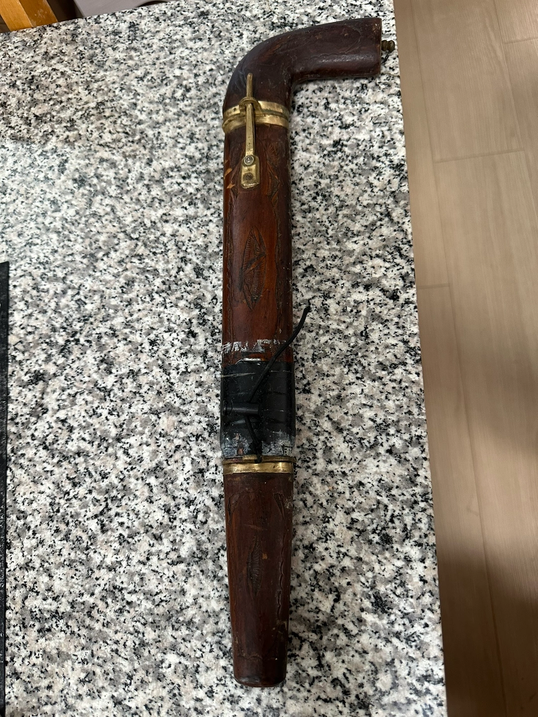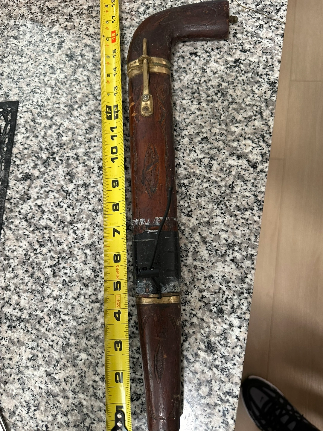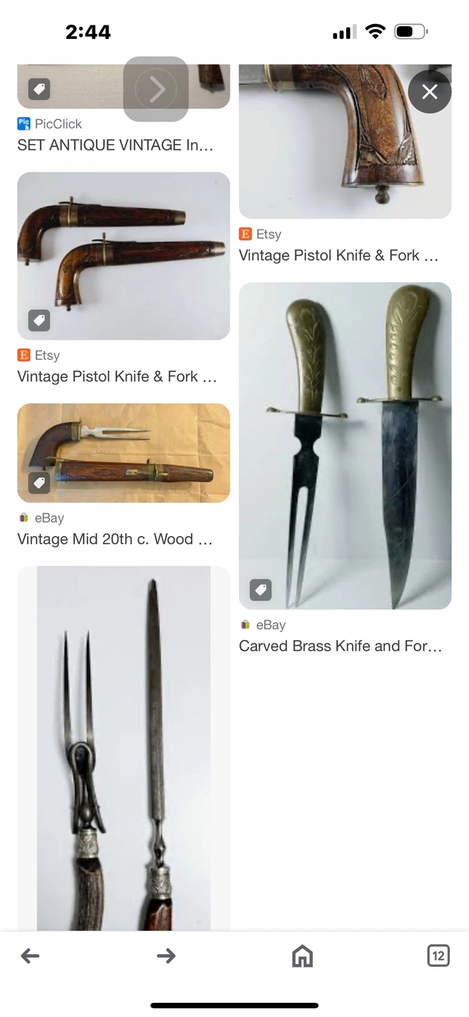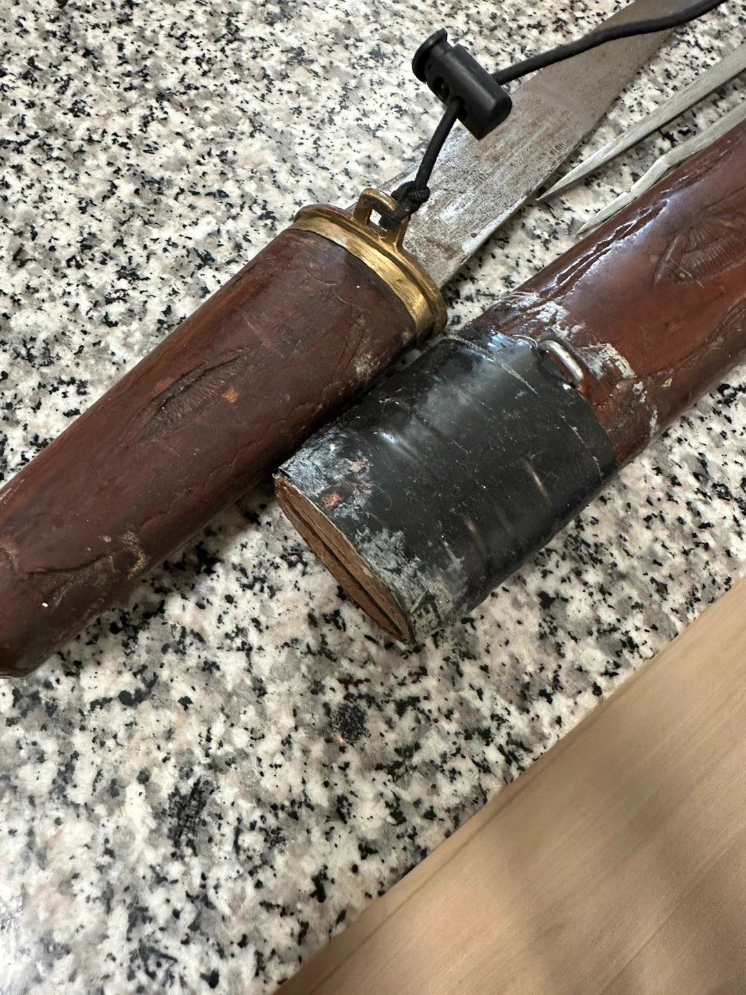 A vintage carving set with a knife, fork, and sheath. The sheath is made of wood and has a carved design. The knife has a wooden handle and a metal blade. The fork has a wooden handle and a metal fork. The set is in good condition and is ready to be used. Case little damage pick up thank you