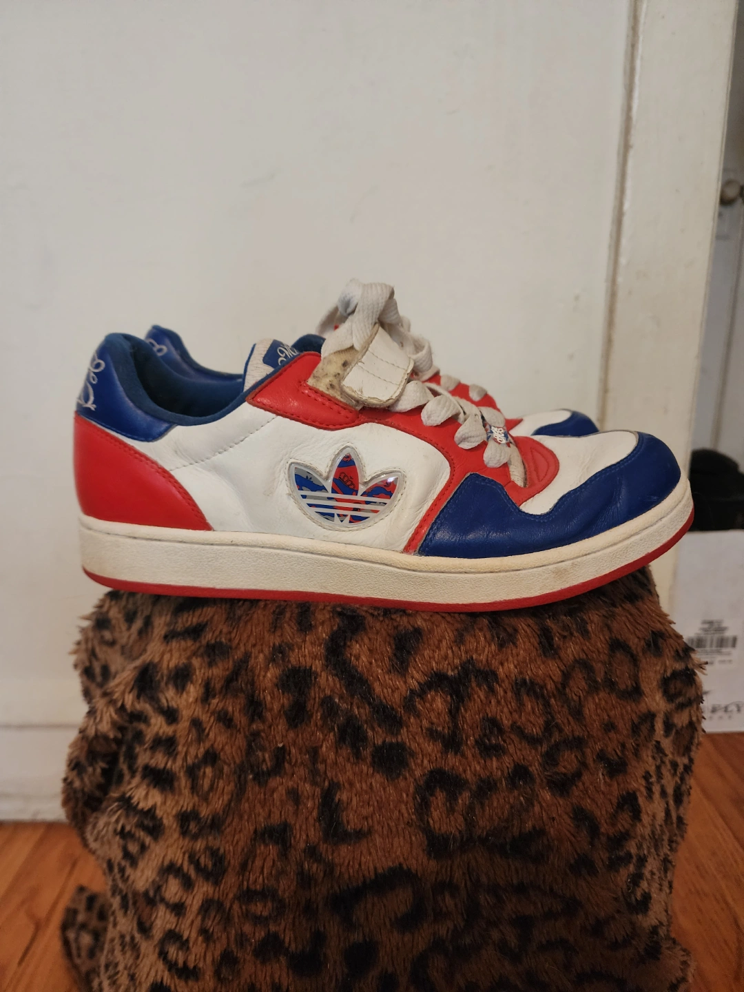 Rare collaboration sneakers. Red, white, and blue colorway. Leather upper. Velcro strap and laces. Slight wear. Vintage Adidas x Mark McNairy Sneakers Size 10 womans. 🧡