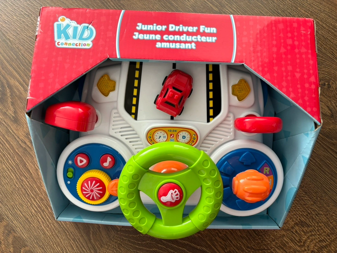 This interactive toy has lights and sounds. It features a steering wheel, gear shifter, car, and buttons.